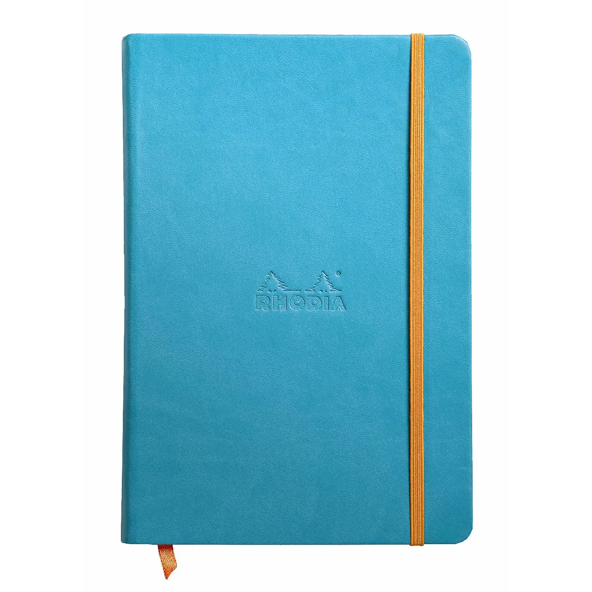 Rhodia - CARNET RHODIARAMA A COUVERTURE RIGIDE en simili cuir coloris turquoise, au format A5. Il comporte 192 pages de papier ivoire, un ruban marque-page orange, une pochette interieure a soufflet au dos et un elastique de fermeture