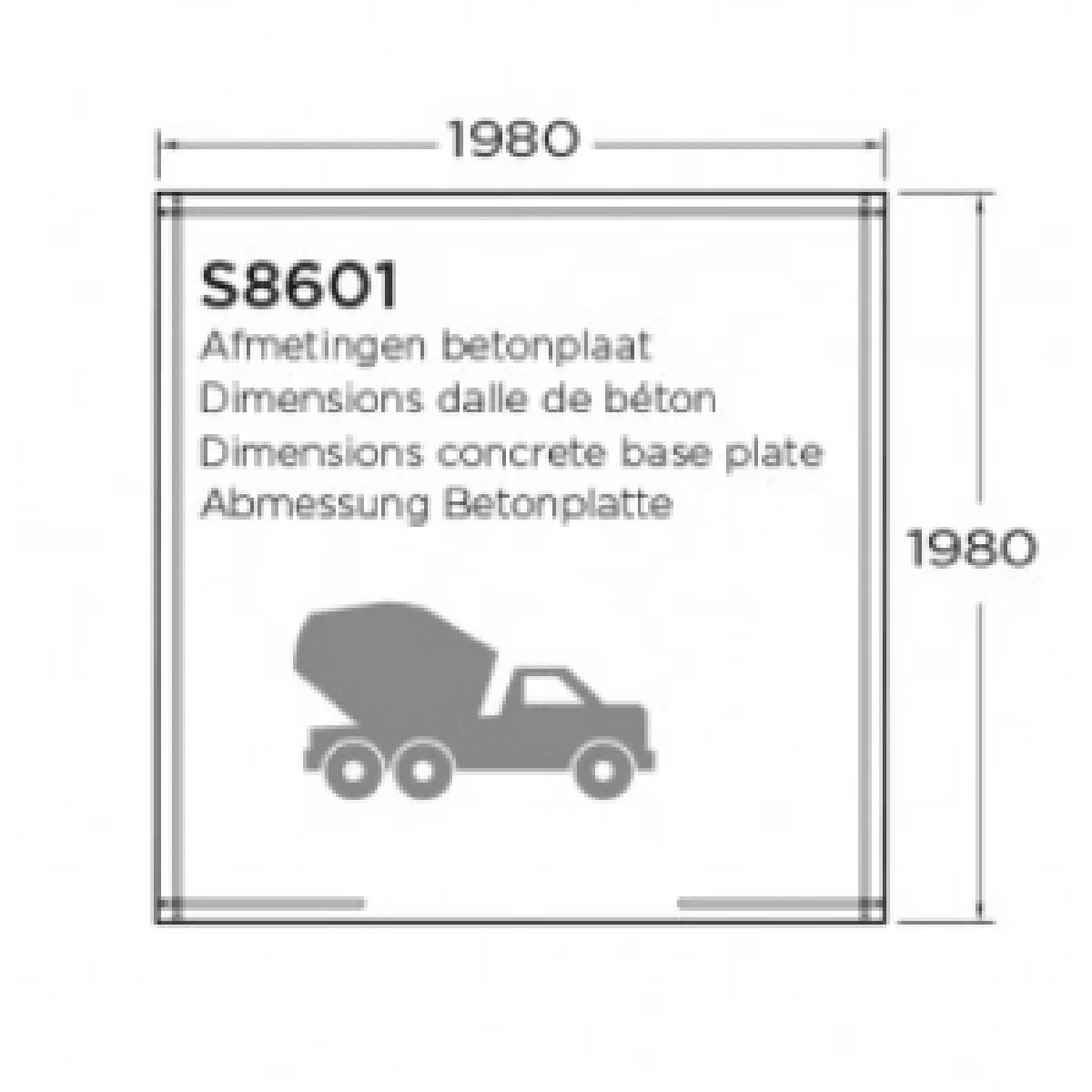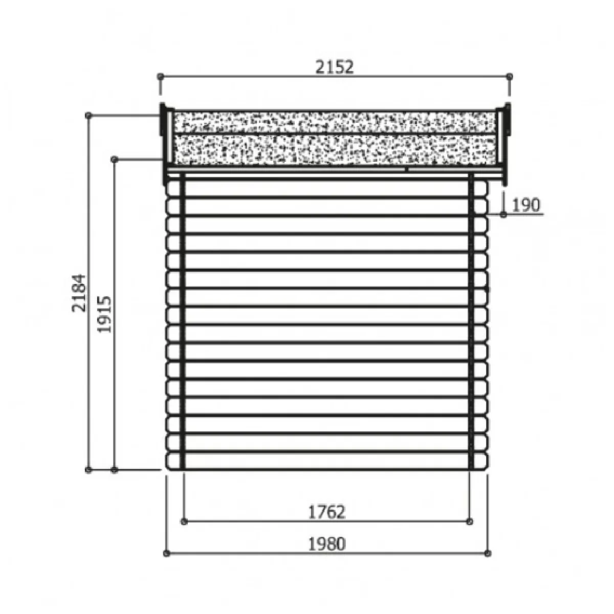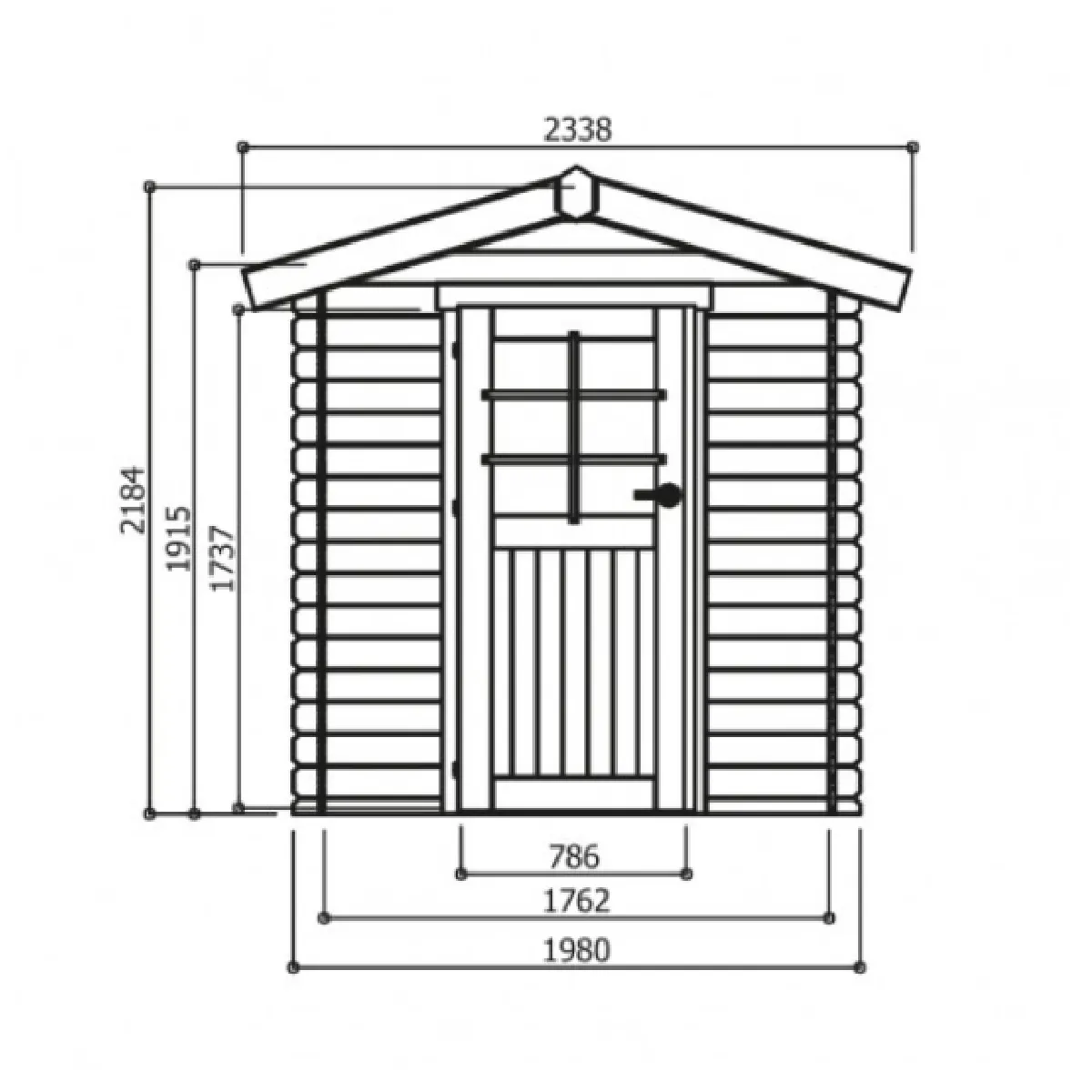 Dimensions de la porte 78,6 x 173,7 cm (l,h). Vitrage Verre securit. Toiture Bois 16 mm + feutre bitumé. Largeur 1,98 m. Longueur 1,98 m. Hauteur 2,184 m. Hauteur goutière 1,73 m. Surface Extérieure 3,92 m². Surface Intérieure 1,76 x 1,76 m = 3,10 m².