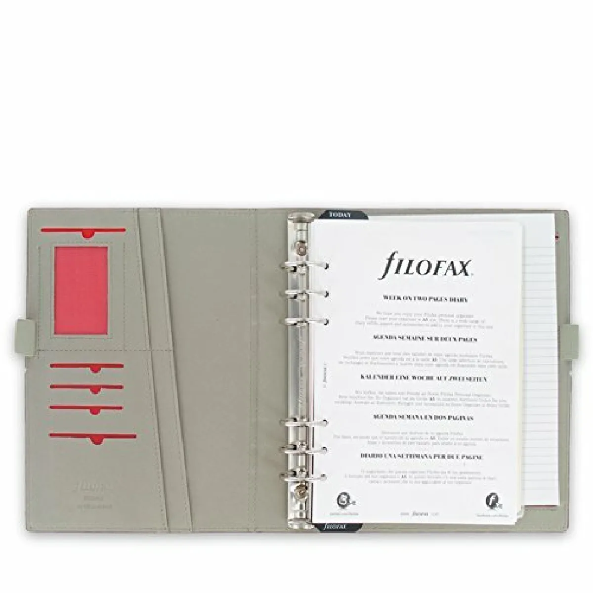 Filofax - Sleek and trendy personal organiser. Contrast colour stitching with elastic closure. Includes week on two pages diary, address pages, and a range of note pages. Size: A5. Red.