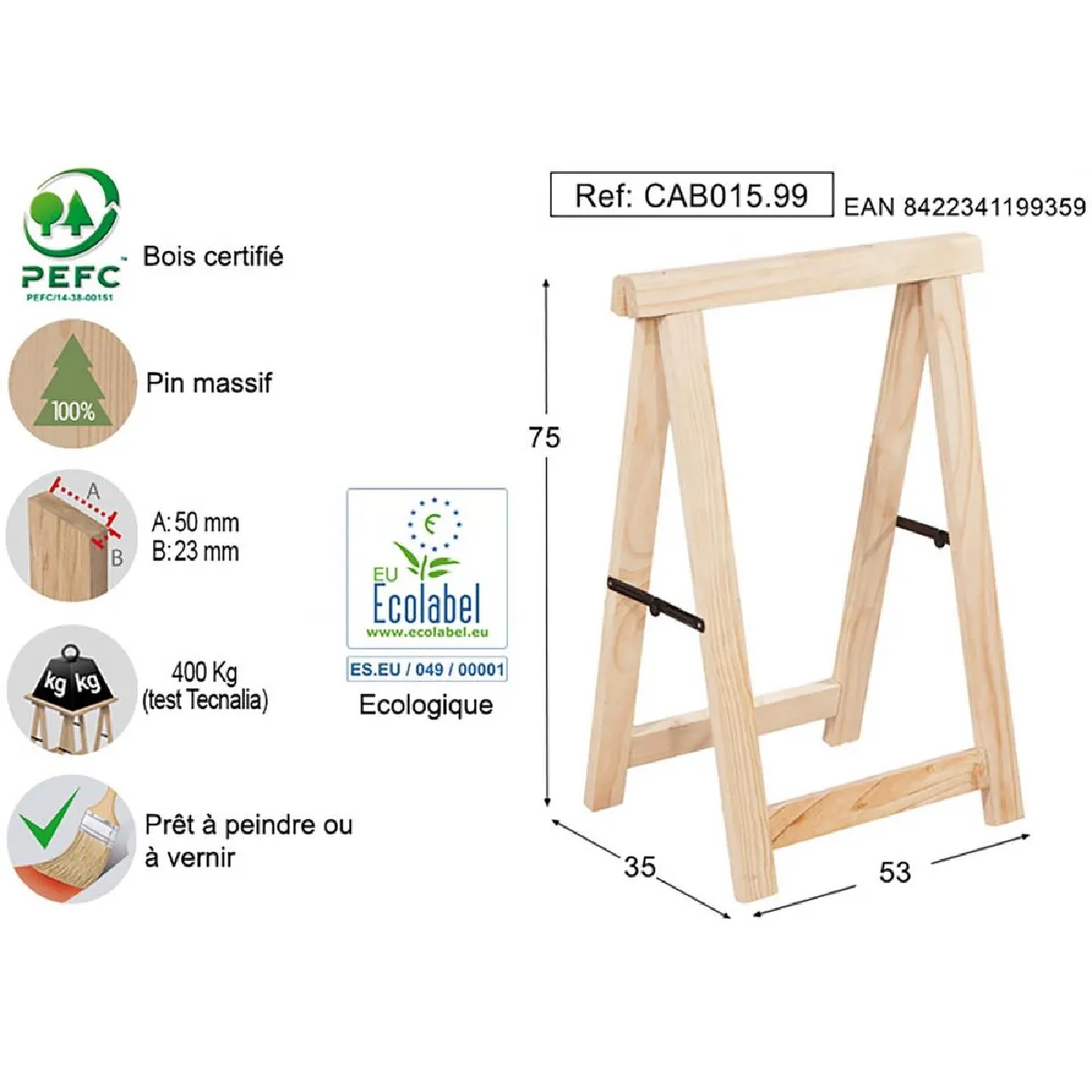 Tréteau en pin - Section 50 x 23 mm - Hauteur 75 cm - Supporte jusqu'à 400 kg