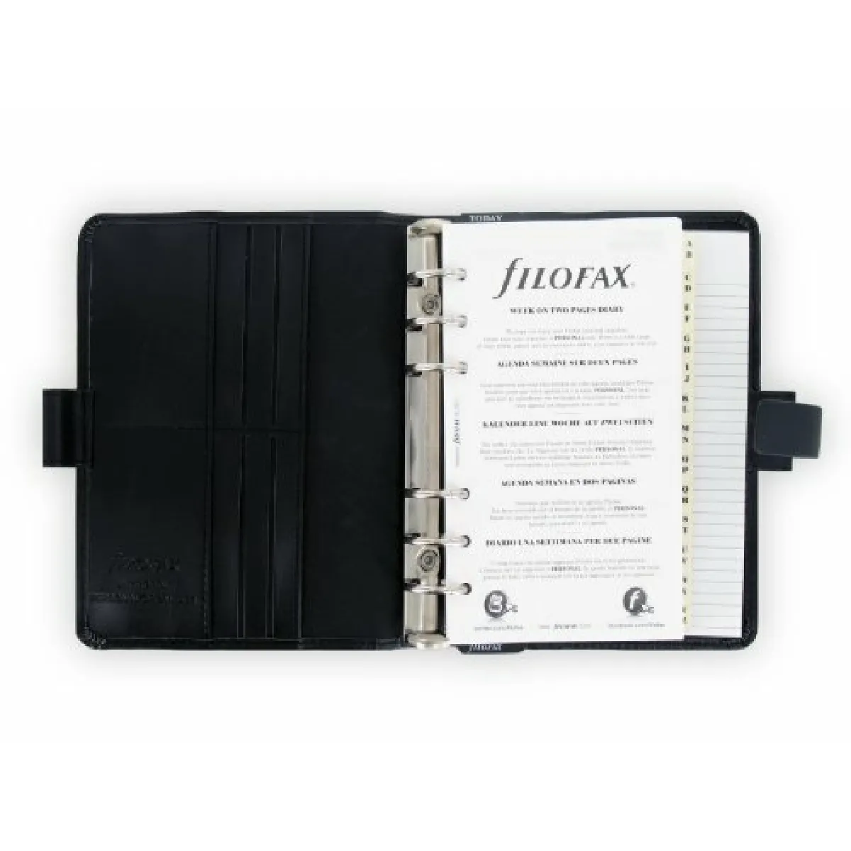 Filofax - description personal metropol matière couverture en polyuréthane caractéristiques mécanisme : 6 anneaux de 23 mm de diamètre a gauche : 6 emplacements pour cartes de crédit; poche de rangement; passant pour stylo. a droite : emplacement permettant d'insérer un bloc-notes; passant pour stylo. recharges fournies feuille protectrice transparente semaine sur 2 pages, horizontale en 5 langues sans heures réglette marque-page index vierge 6 onglets crème uni index alphabétique 2 lettres crème feuilles de notes lignées feuilles de nom / adresse / téléphone feuilles actions / priorités carte du monde porte photo ouverture en haut bloc-notes glissé dans la couverture