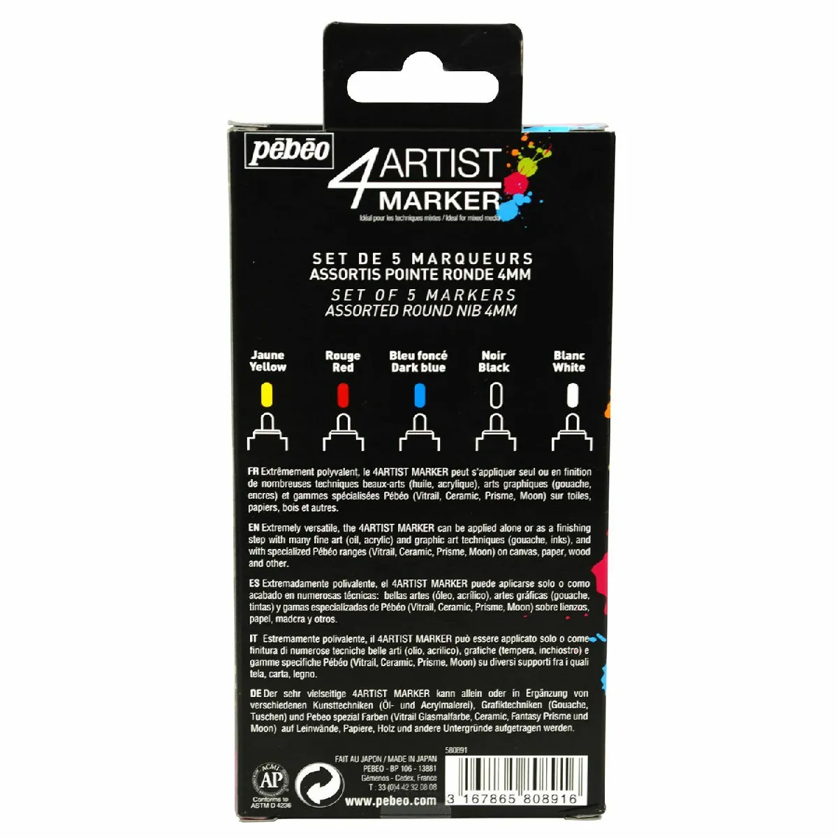 Set de 5 marqueurs base huile tous supports. Ces marqueurs aux couleurs primaires ont une finition brillante et opaque. Le séchage du tracé est rapide et varie selon la quantité de peinture déposée. Celle-ci résiste d'ailleurs particulièrement bien à la lumière. Vous pouvez appliquer la peinture sur tous types de supports tels que : du bois, du papier, du métal, du verre, du plastique, de la porcelaine, du plâtre et plus encore ! Combinez-le avec du Bindex pour éviter une perte de brillance des couleurs. Pour l'utiliser, vous devrez l'amorcer : secouer le marqueur fermement, puis appuyer plusieurs fois sur la pointe contre le support afin de l'imbiber de peinture. Taille de la mine : 4 mm.