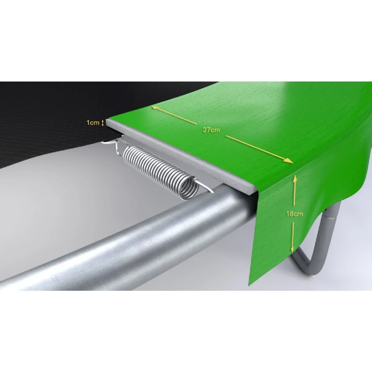 Pour vérifier la compatibilité, il suffit de mesurer le diamètre total du trampoline. L'installation se fait en fixant la jupe à la base et en insérant un ressort dans chaque languette prévue à cet effet. La jupe de 8 cm et la conception large aident à couvrir correctement le périmètre, tout en offrant un rembourrage confortable et stable autour des ressorts. La construction est pensée pour un usage extérieur régulier, avec une surface solide et confortable et un maintien fiable pendant les séances de saut.