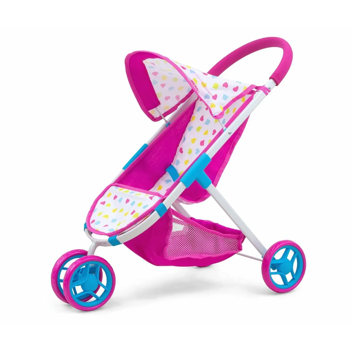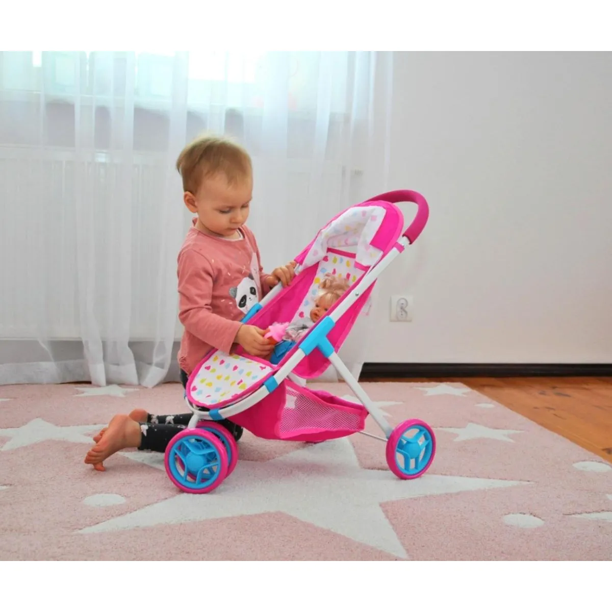 La structure à trois roues avec roue avant pivotante facilite les virages et les demitours lors des jeux quotidiens. Adaptée aux poupées jusqu'à 50 cm, elle offre une tenue sûre grâce aux ceintures de sécurité à trois points. Les roues en mousse limitent les bruits sur les sols d'intérieur et roulent sans entretien, tandis que la poignée avec revêtement en mousse assure une prise confortable pour les petites mains. Le cadre métallique apporte une rigidité appréciable pour un usage régulier.