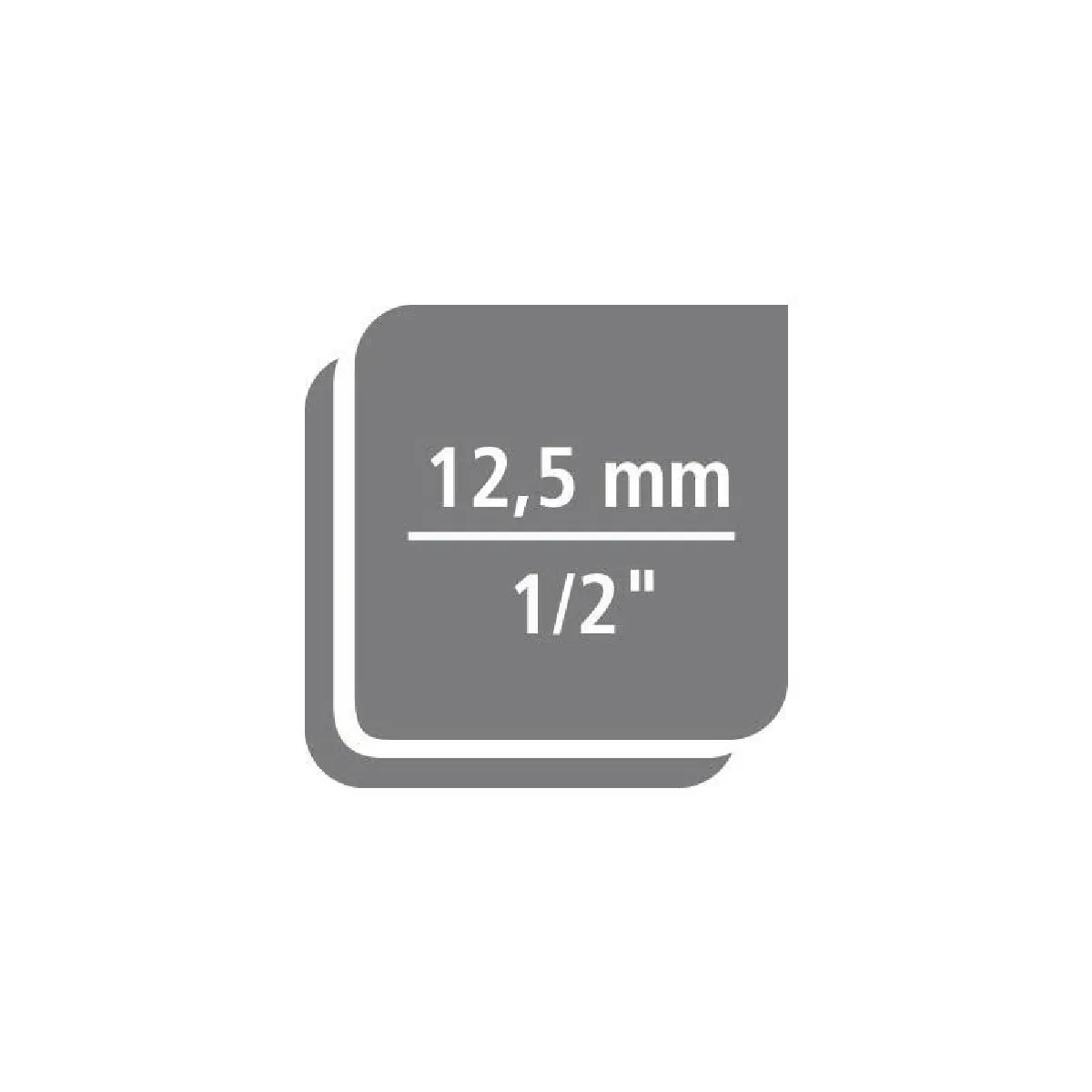 La transmission du couple reste maîtrisée grâce à l'entraînement à 4 pans femelle conforme DIN 3120 - C 12,5 et ISO 1174, assurant un accouplement fiable avec les cliquets 1/2". Le profil hexagonal de 8 mm s'adapte aux vis femelles à 6 pans pour des opérations de vissage sûres et répétables. La pointe traitée au phosphate de manganèse favorise l'adhérence dans l'empreinte, limitant le ripage lors des serrages et desserrages. La finition chromé mat pour une lecture claire des marquages réduit les reflets en atelier et facilite l'identification de la taille.