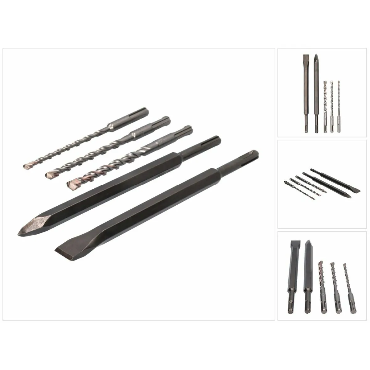 - Contenu : forets Ø 6,0 / 8,0 / 10,0 mm (160 mm), burin pointu 250 mm, burin plat 20 x 250 mm, boîte