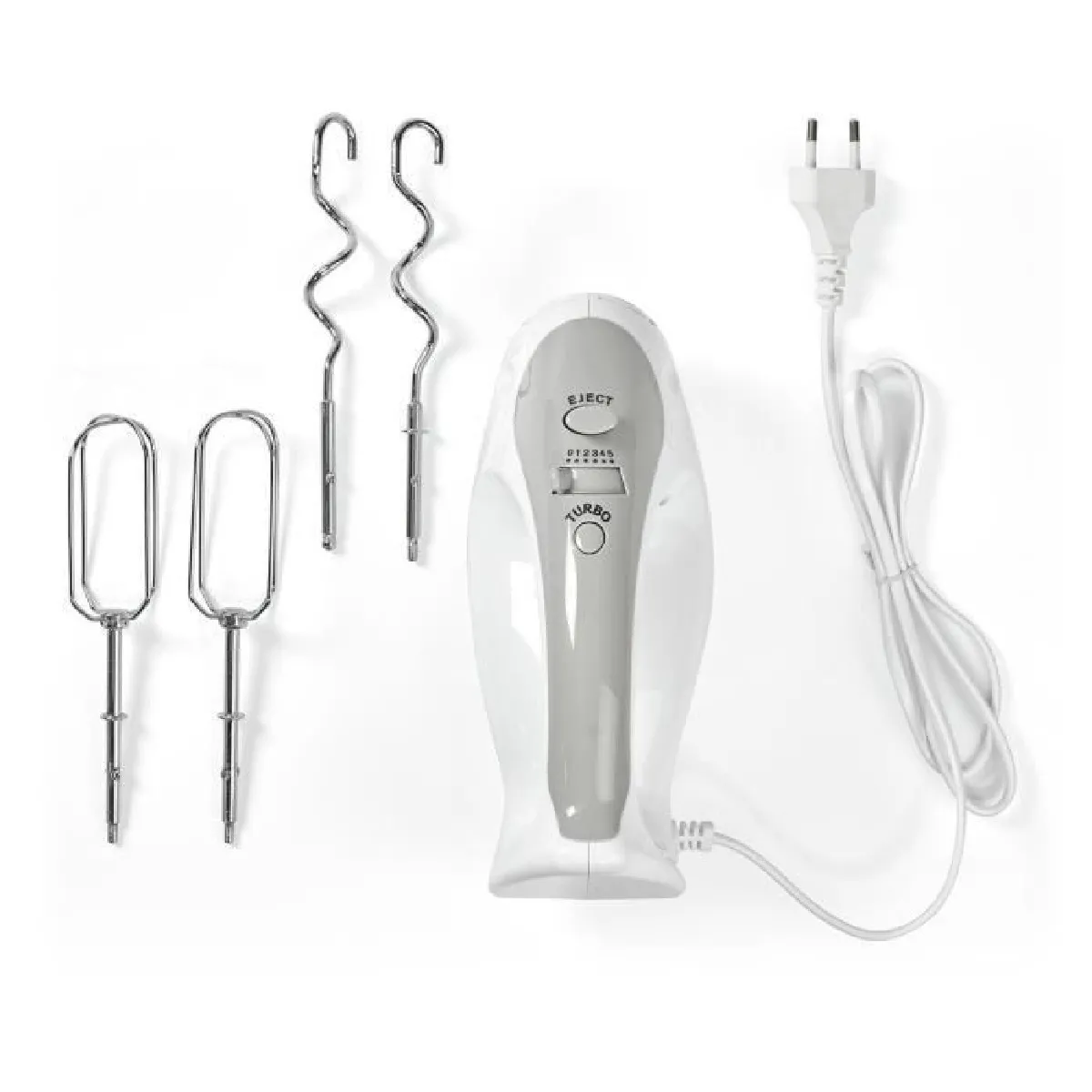 Batteur à main électrique - 5 vitesses + Turbo - Bouton d’éjection - Fouets et crochets chromés - Silencieux - Alimentation 230V