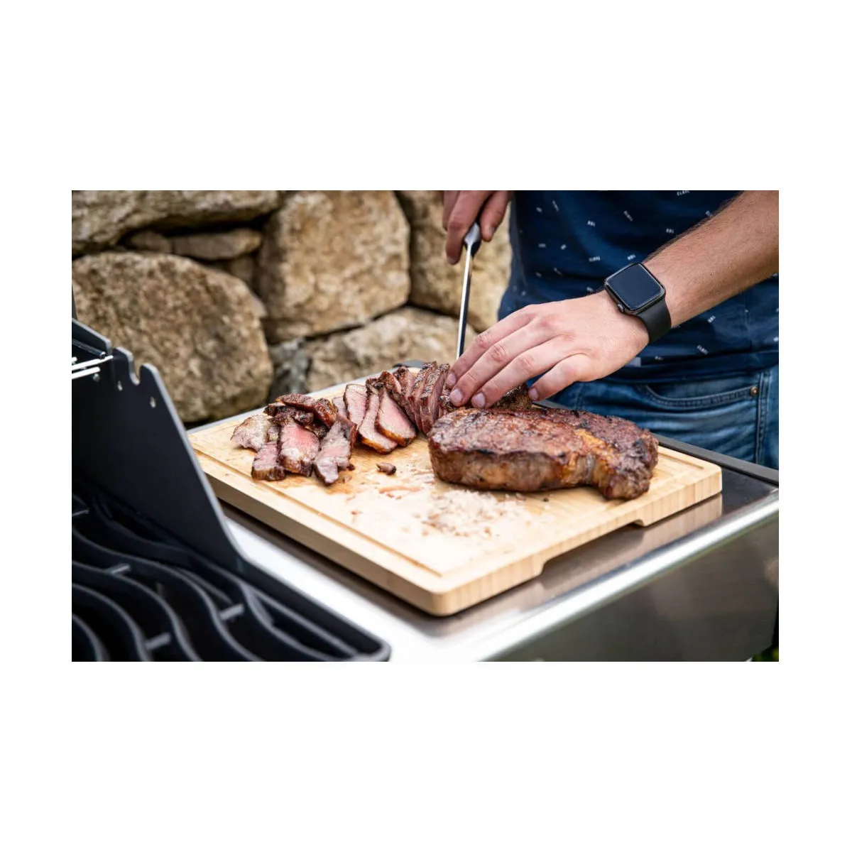 Commentaire vendeur : Préparez vos plats avec facilité grâce à la planche à découper essentielle de Napoléon.Fabriquée en bambou naturelle antibactérien, cette planche polyvalente sert également de plateau de service élégant. Spécialement conçue pour les barbecues Rogue et Rogue XT de Napoléon, elle mesure 27 x 37 cm pour s'adapter parfaitement aux tablettes latérales.Les pieds en silicone assurent une stabilité optimale lors de la découpe, préservant ainsi la surface de la tablette.Les poignées ergonomiques et les rainures de la planche facilitent la manipulation et la récupération des jus, offrant un espace de travail toujours propre et opérationnel. Caractéristiques techniquesCompatibilité : Barbecue Napoléon RogueCouleur : NaturelMarque : NAPOLÉONMatière(s) : BambouType de produit : Planche à découper
