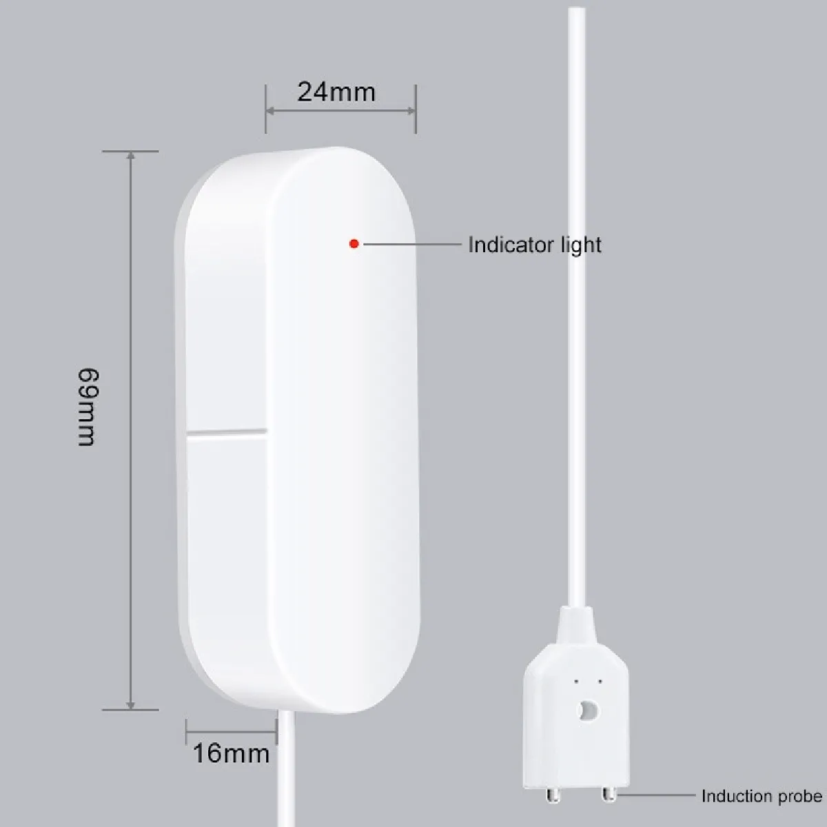 1. Contrôle Wifi sans fil. 2. L'application mobile pousse une alarme pour éviter les fuites d'eau et peut interroger l'enregistrement d'alarme en temps réel. 3. Batterie amovible, le temps de veille peut atteindre 8 mois. 4. IP67 étanche, peut protéger la sonde d'immersion. 5. Il est prêt à l'emploi et facile à installer. Paramètres du produit: 1. Tension d'entrée: DC 3V LR03. 2. Courant de repos: inférieur ou égal à 10 microampères. 3. Courant d'alarme: inférieur ou égal à 160mA. 4. Basse tension et sous-tension: inférieure ou égale à 2,6 V. 5. WiFi: 802.11b / g / n. 6. Méthode de détection: détection d'eau. 7. Méthode d'installation: montage mural. 8. Température de fonctionnement: -10-50 degrés Celsius. 9. Humidité de fonctionnement: 95% HR max. 10. Dimensions: 24x69x16 mm.