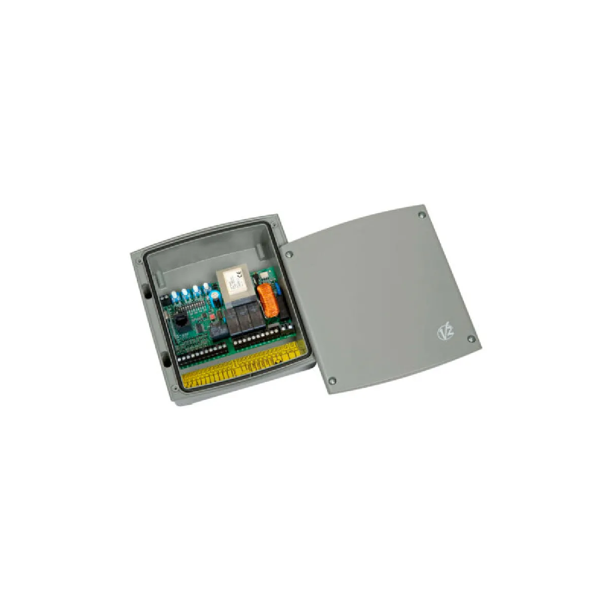 Armoire de Commande V2 FLEXY2 12G035. Paramétrage et programmation par bouton et voyant. Type d’alimentation 230v avec 2 moteurs monophasés. Il est fourni avec un radio-récepteur inclu 433,92 MHz. Mémorisation jusqu’à 240 Télécommandes Personal-Pass 433,92 MHz. Connecteur “RJ45” pour branchement avec le programmateur PROG2 en utilisant un câble de réseau (UTP). Gestion de démarrage, démarrage piéton et arrêt