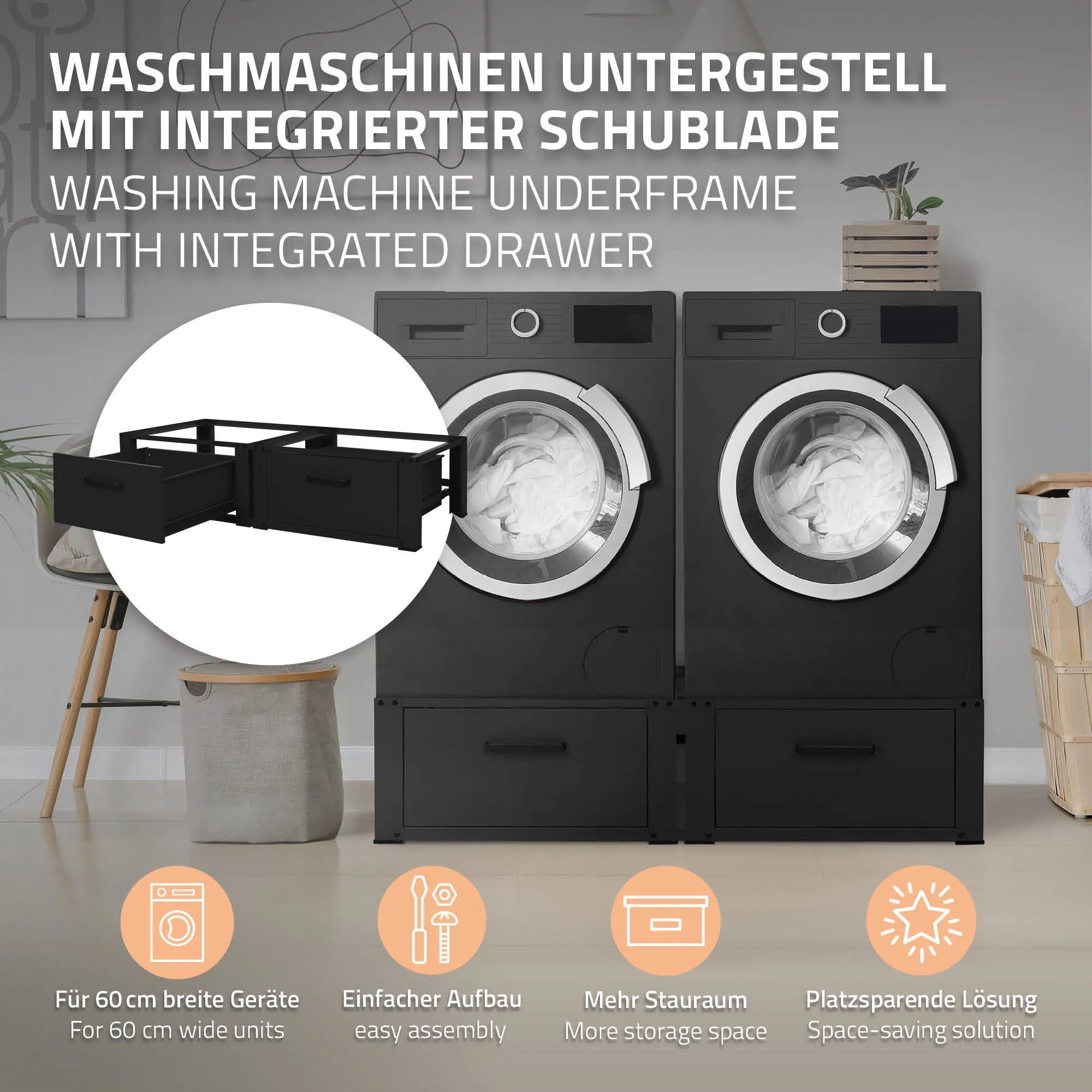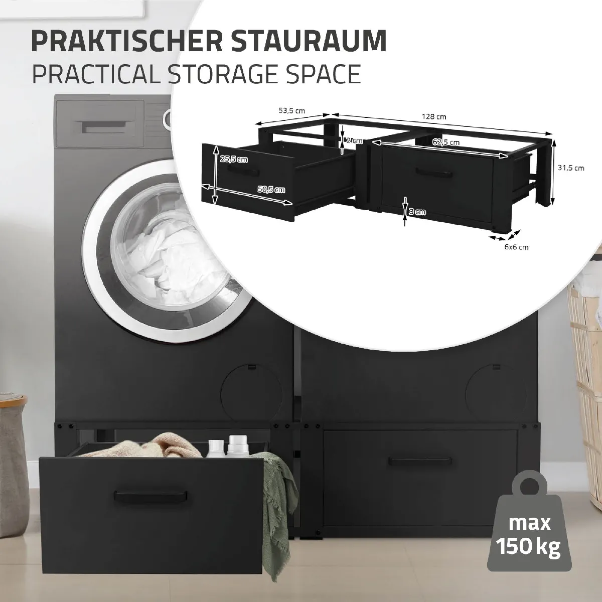 Avec une largeur totale de 128 cm, une profondeur de 53,5 cm et une hauteur de 31,5 cm, la structure élève efficacement les machines tout en libérant une surface de rangement pratique avec deux tiroirs coulissants. Chaque tiroir s'étire jusqu'à 38 cm et propose un volume utile de 48 x 42,5 x 19,8 cm, idéal pour lessives et accessoires. Les façades de 50,5 x 25,5 cm avec poignées en aluminium assurent une prise sûre et durable, tandis que la compatibilité universelle pour appareils de 60 cm simplifie l'installation dans les petites buanderies.