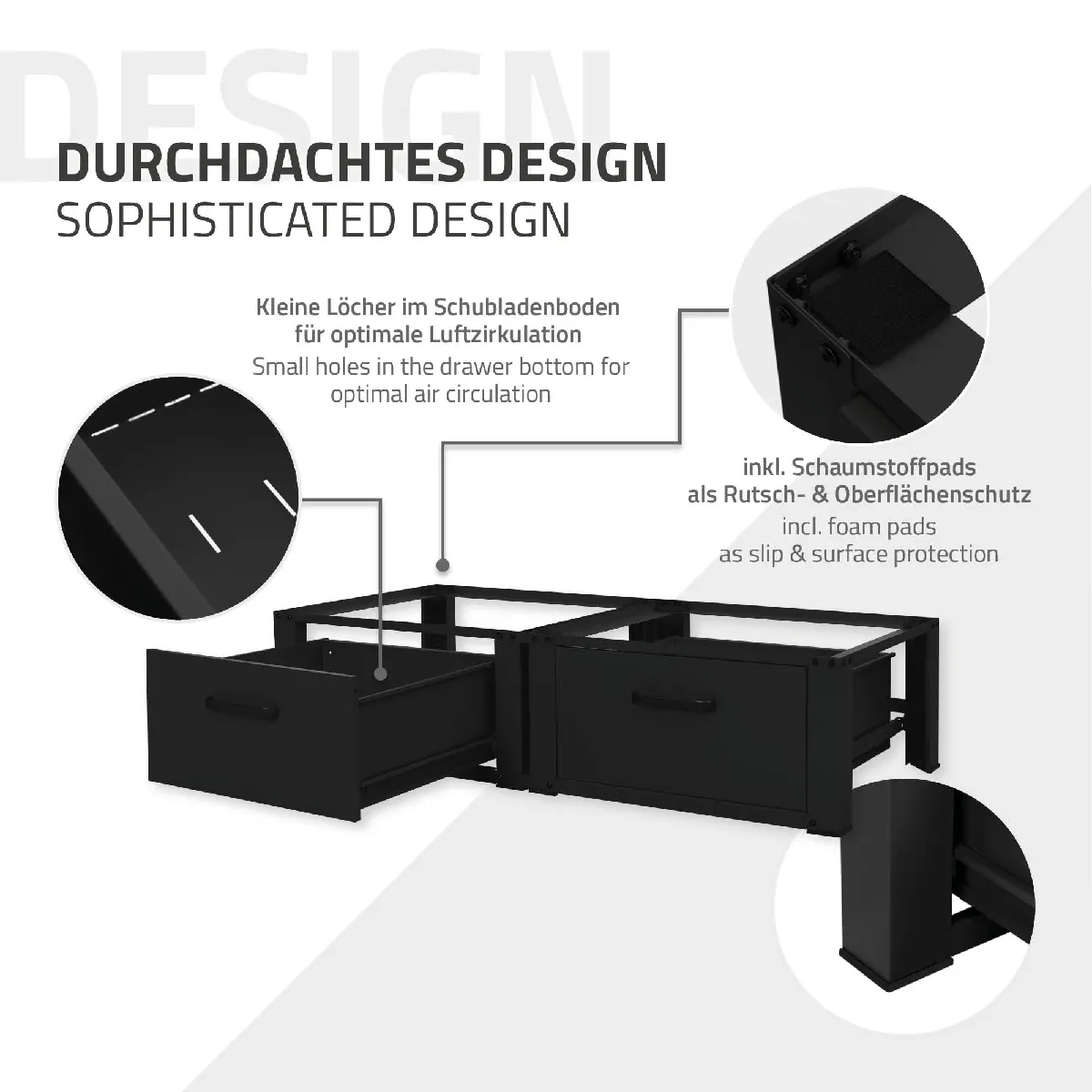 Optimise l'espace de la buanderie grâce à une surélévation robuste en acier revêtu par poudre qui facilite le chargement et ménage le dos. Conçu pour deux appareils de 60 cm de large, ce socle double offre une stabilité fiable jusqu'à 2 x 150 kg de charge tout en intégrant des tiroirs spacieux pour garder les accessoires de lavage à portée de main. Les pieds caoutchoutés et la mousse de protection antidérapante et de protection de surface contribuent à limiter les vibrations et à protéger le sol. Le coloris noir s'intègre facilement dans les espaces techniques.