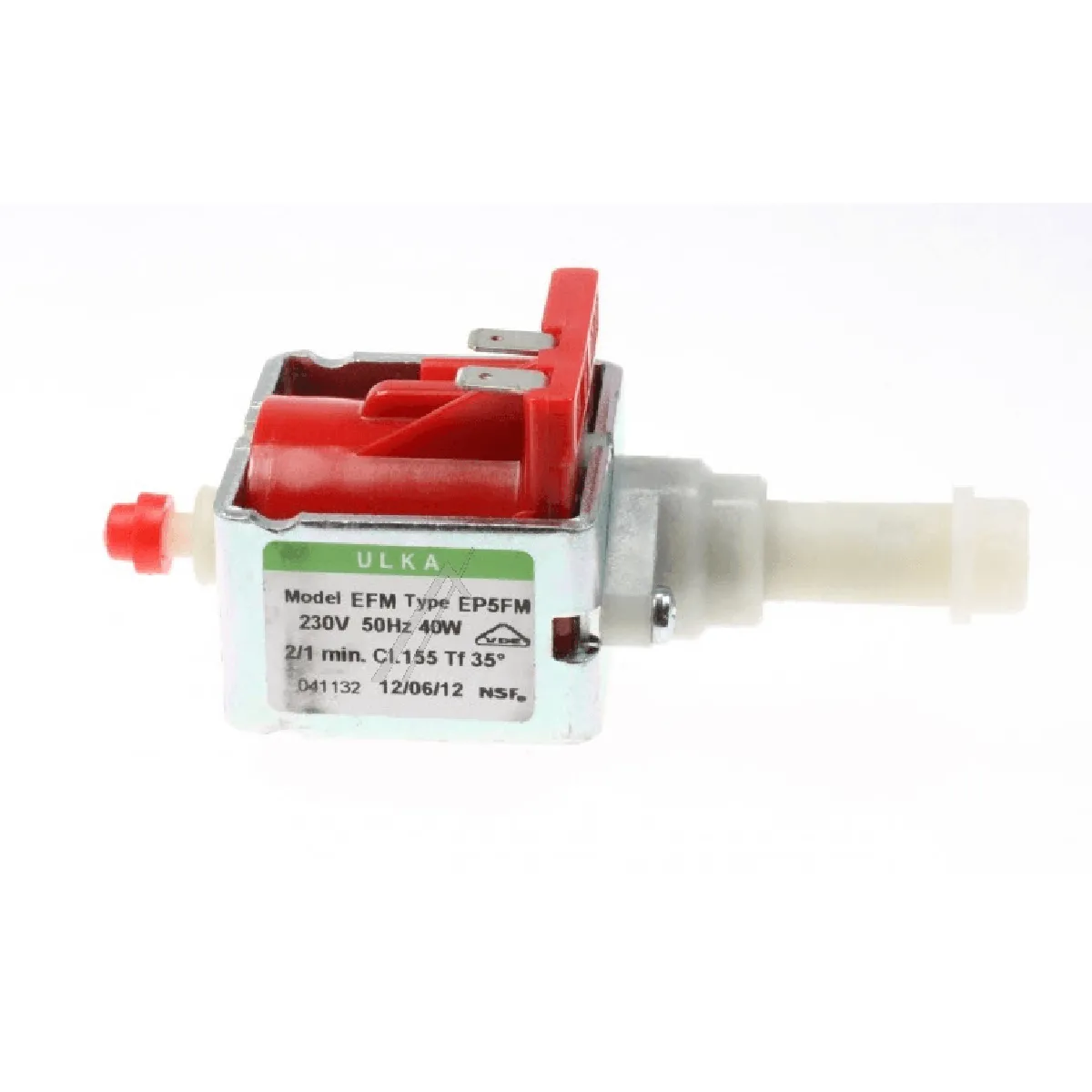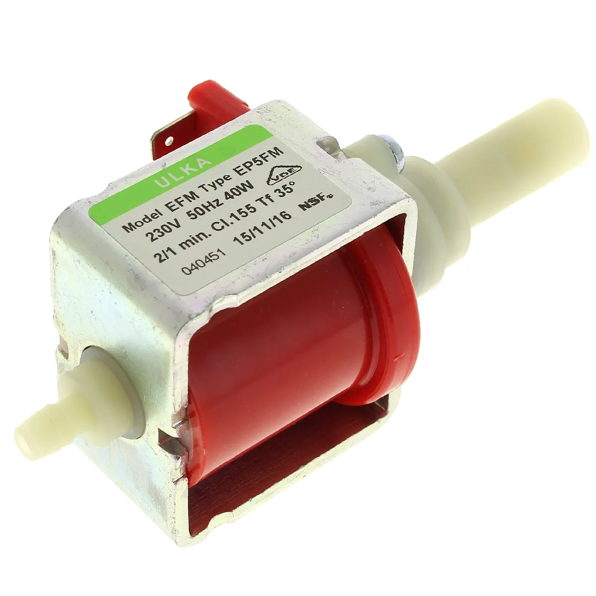 Pompe pour centrale de repassage - 40W AC 230V - Entrée 14 mm - Sortie 6,3 mm - 2 cosses 6,3 mm - Fabricant Ulka - Compatible Polti/Vaporetto/Hoover/Miele