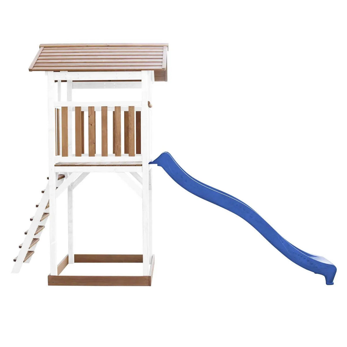 Ils peuvent monter les escaliers qui mènent à la tour. De là, ils ont une vue magnifique sur tout le jardin. Il est temps de redescendre ? Ensuite, ils glissent rapidement et facilement vers le bas sur la longue glissière. Sous la tour de jeu se trouve un bac à sable où ils peuvent tous faire des tartes au sable. La combinaison du bois marron donne à cette tour de jeu un aspect estival que chaque jardin rayonne. La tour de jeu Beach Tower a une hauteur de plate-forme de 117,5 cm et est équipée d'un grand toboggan de 228 cm de
