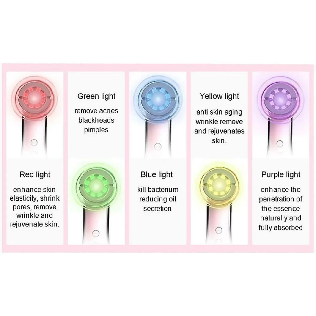 - LED rouges, vertes, bleues, jaunes et violettes pour renforcer les effets des soins