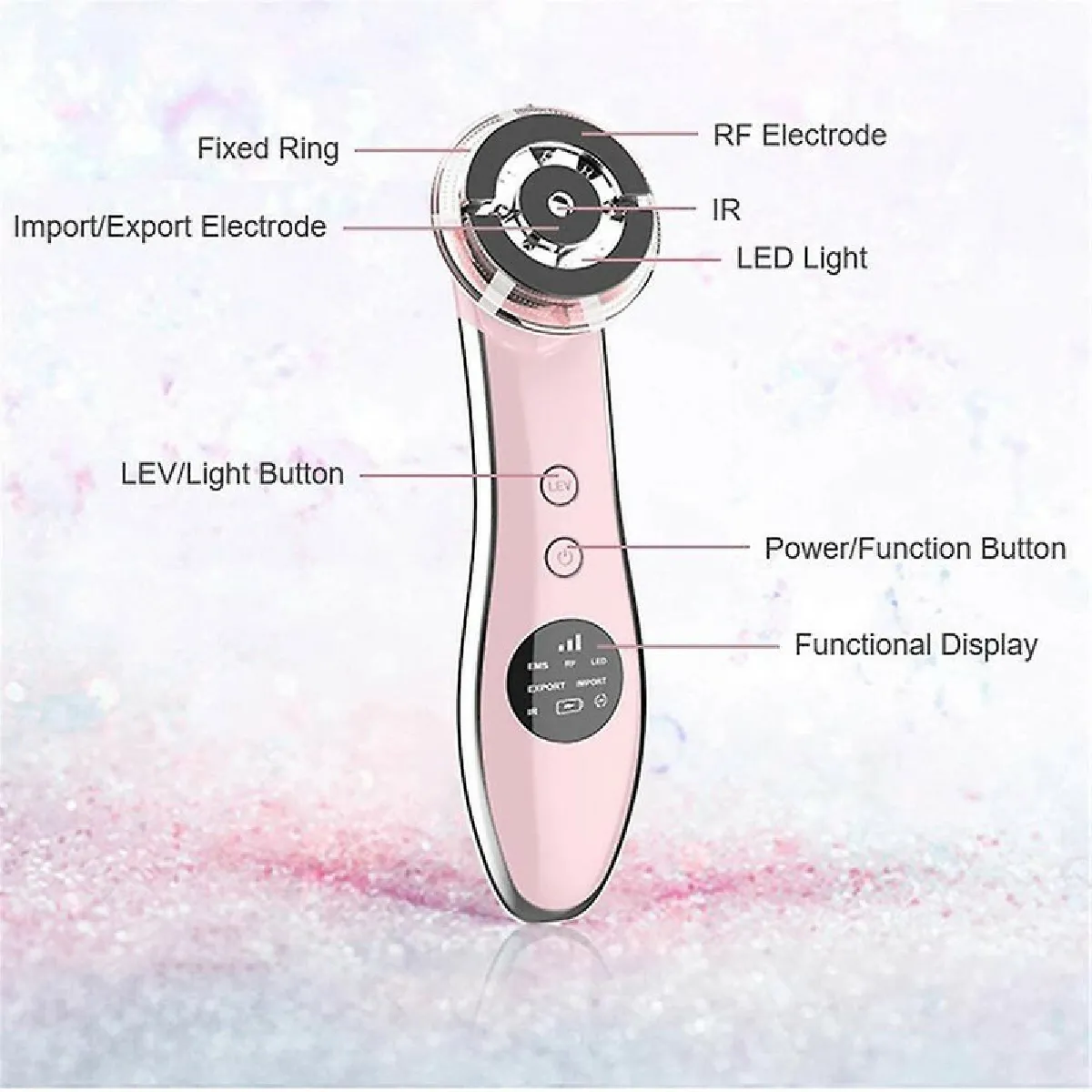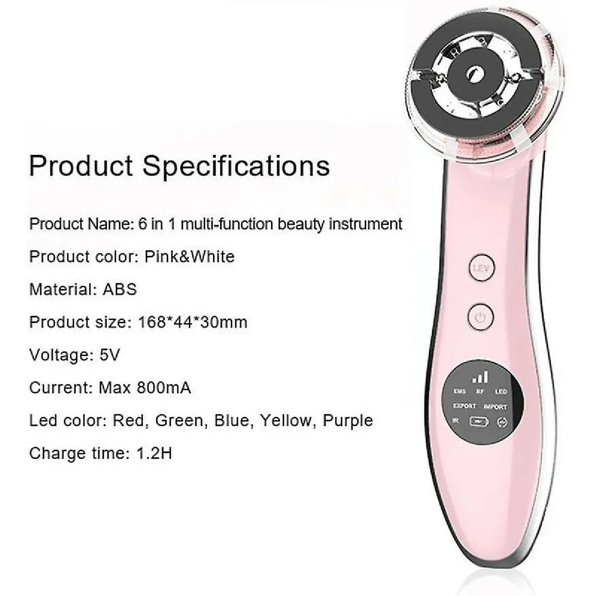 Pensé pour une routine efficace à la maison, cet appareil propose quatre modes combinant technologies de soin et lumière LED pour soutenir la fermeté et la douceur de la peau. L'utilisation régulière vise un effet de lissage et de raffermissement du visage, tout en optimisant l'absorption des produits appliqués. Les LED rouges, vertes, bleues, jaunes et violettes s'activent selon le mode choisi afin de renforcer les bénéfices de chaque étape. Une batterie lithium rechargeable pour un usage sans fil et un écran LED simplifient la prise en main au quotidien. Une minuterie intégrée émet un signal après 5 minutes pour guider la durée de chaque session.