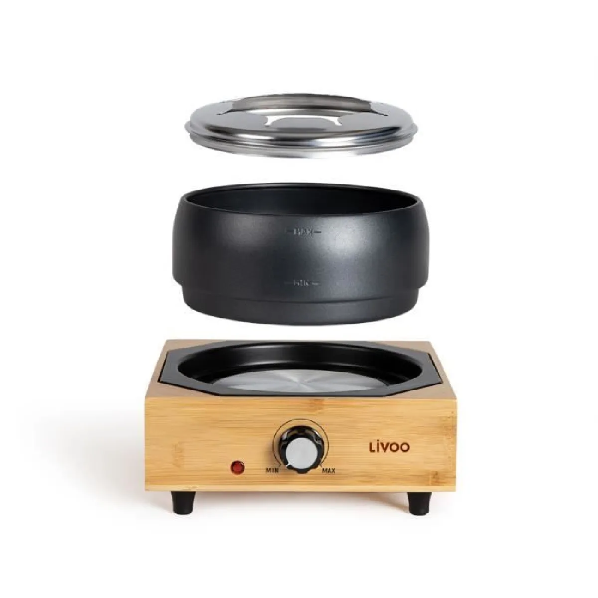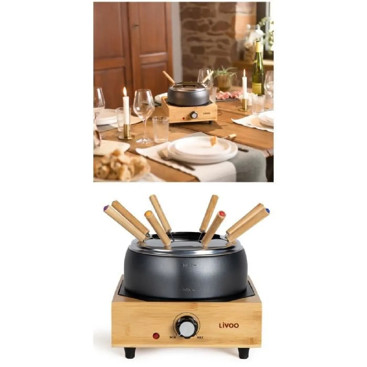 Appareil à fondue électrique - 1500 W - Thermostat ajustable - Caquelon antiadhésif - Support en bois - 8 fourchettes - Protection antiéclaboussures