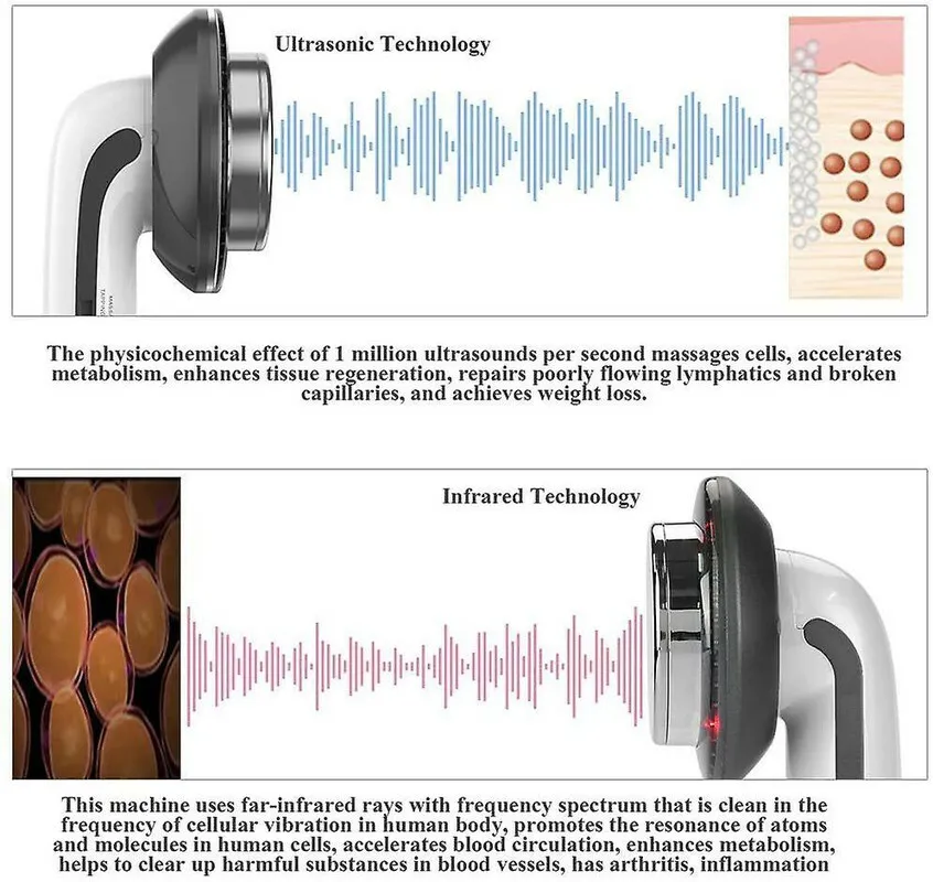 Dispositif minceur et soin du corps/visage - EMS - LED rouge/bleu - Ions +/- - Ultrasons - Modes massage et pétrissage - Intensité réglable