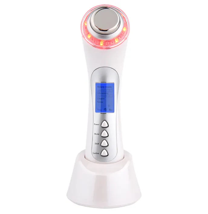 Appareil de soin du visage ultrasonique - LED photons rouge/bleu/vert - ions+/- - nettoyage en profondeur - massage chauffant - améliore absorption des soins