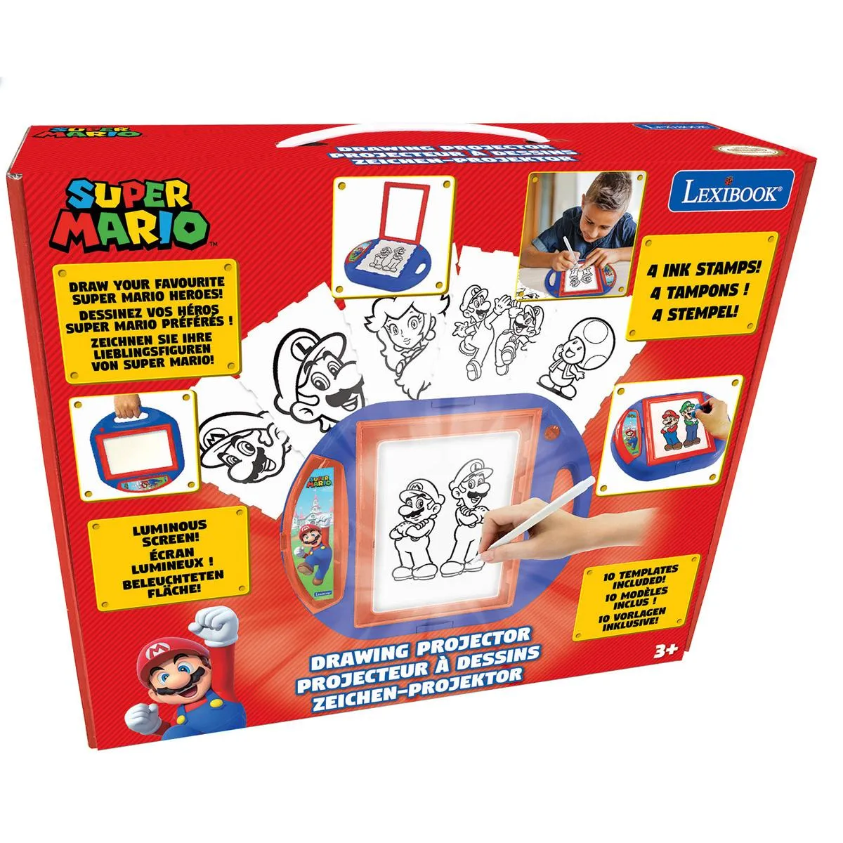 * Un fantastique projecteur de dessin avec un écran format A5, 10 gabarits et 4 tampons inspirés de l'univers de Super Mario, pour apprendre à dessiner en s'amusant. Très facile à utiliser grâce à son écran lumineux et à son installation pratique, ce projecteur s'ouvre pour ranger tous les accessoires, et le transporter partout.