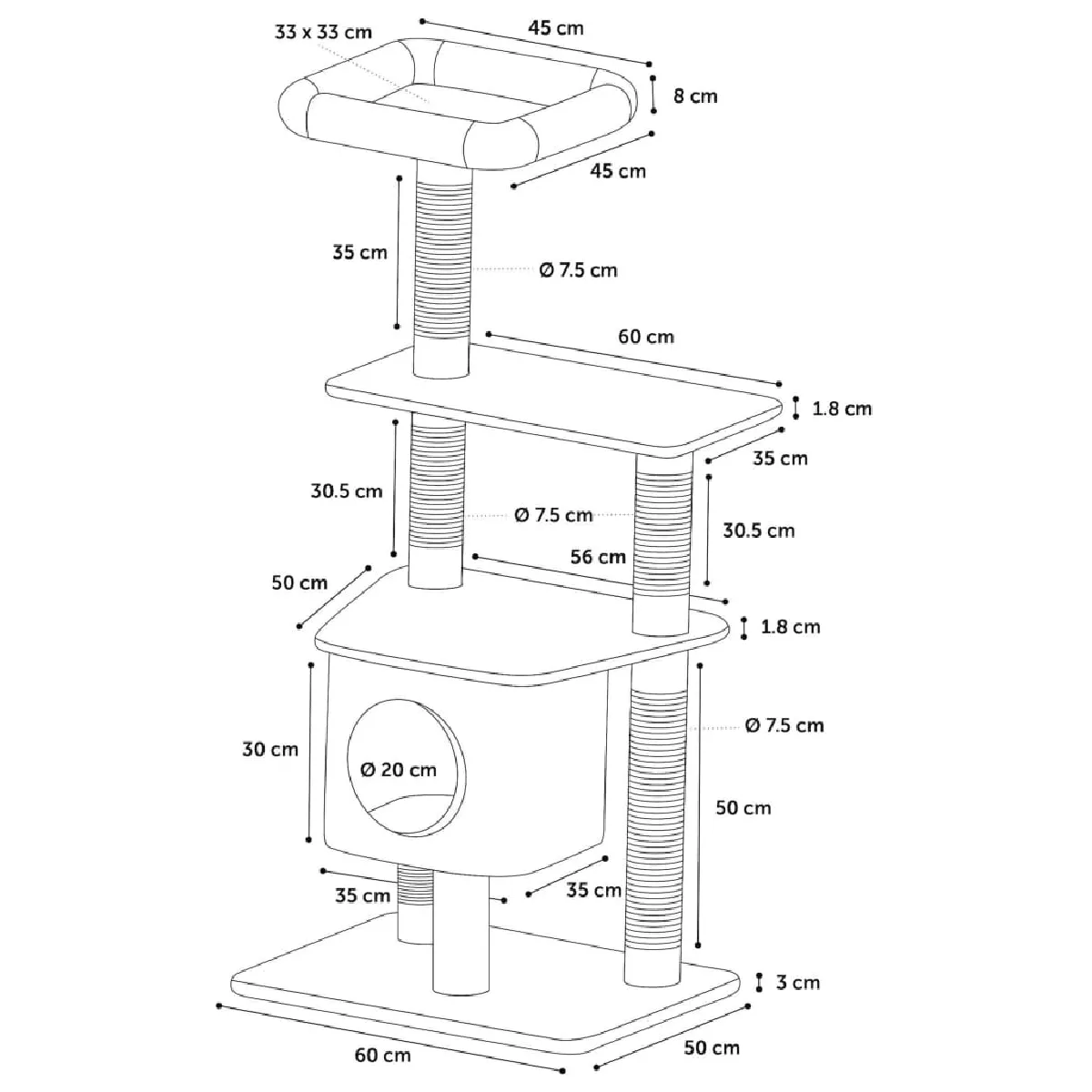 Arbre à chat - Niche - Poteaux sisal - Tissu doux - 3 plateformes