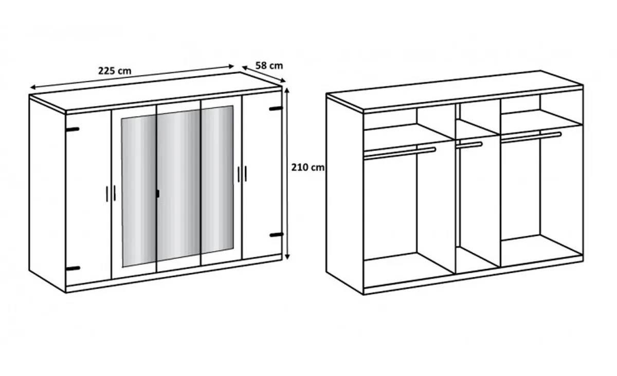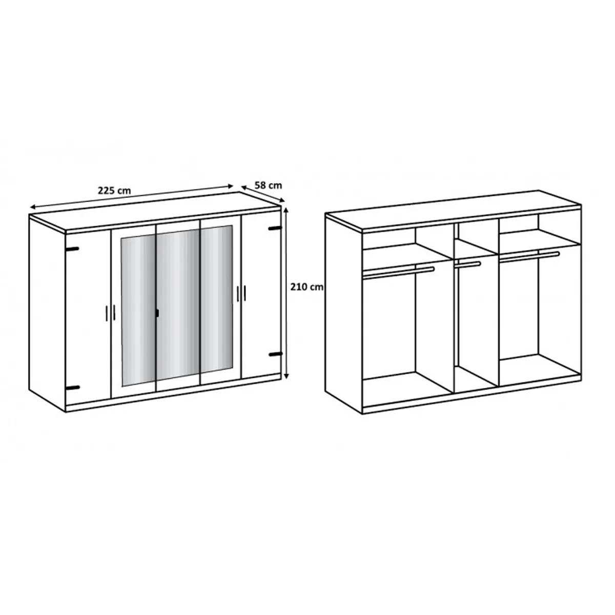 La structure en panneaux de particules mélaminés propose une surface facile d'entretien adaptée à un usage quotidien. Les dimensions assurent un linéaire continu sur 225 cm, pratique pour regrouper vêtements saisonniers et accessoires. Les miroirs, centrés sur la façade, favorisent une routine de préparation efficace, tandis que la hauteur de 210 cm exploite la verticalité pour des étagères et modules internes. Le coloris chêne offre un rendu chaleureux compatible avec linge de lit neutre et éclairages doux.