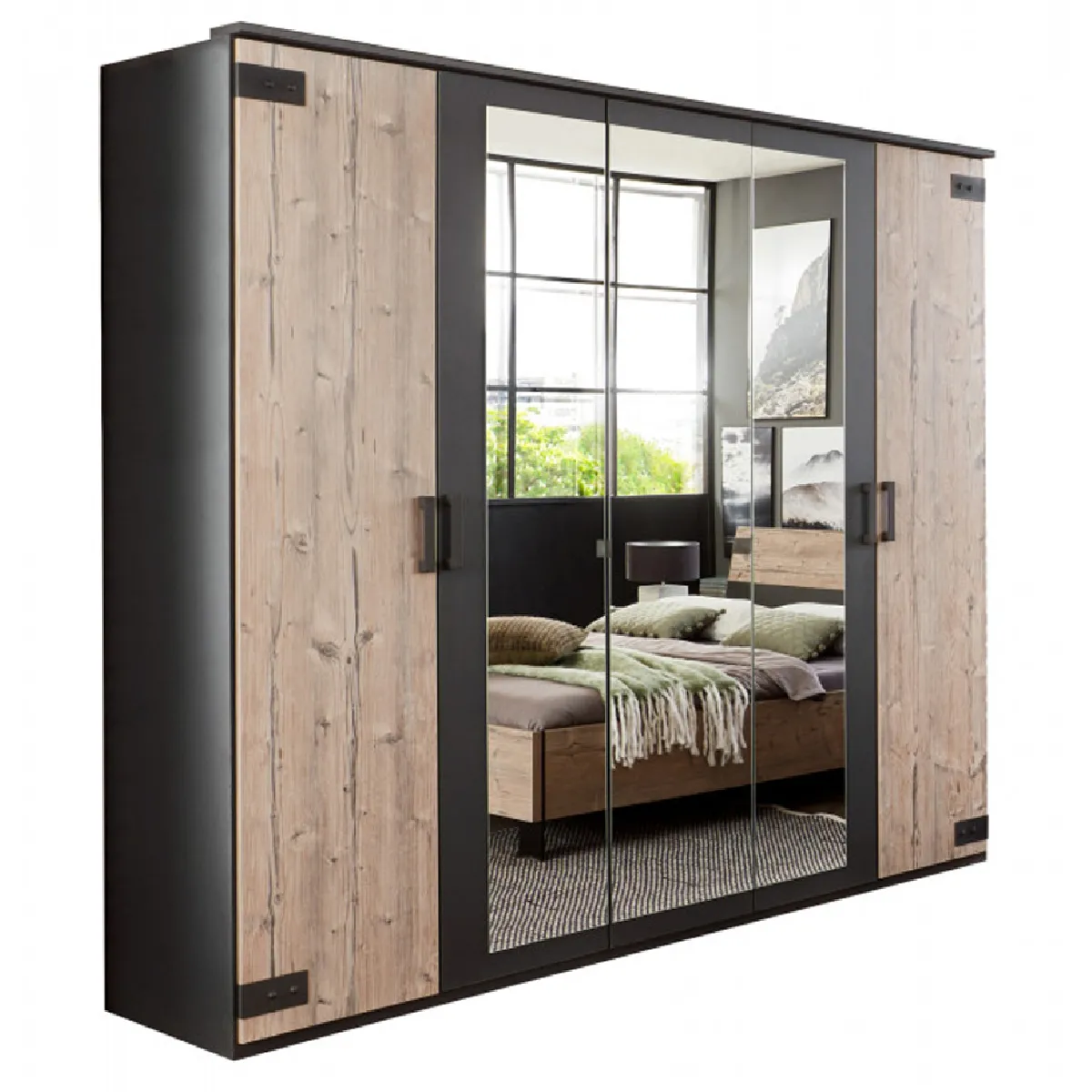 Armoire 5 portes avec miroir - style industriel - panneau de particules - 3 étagères