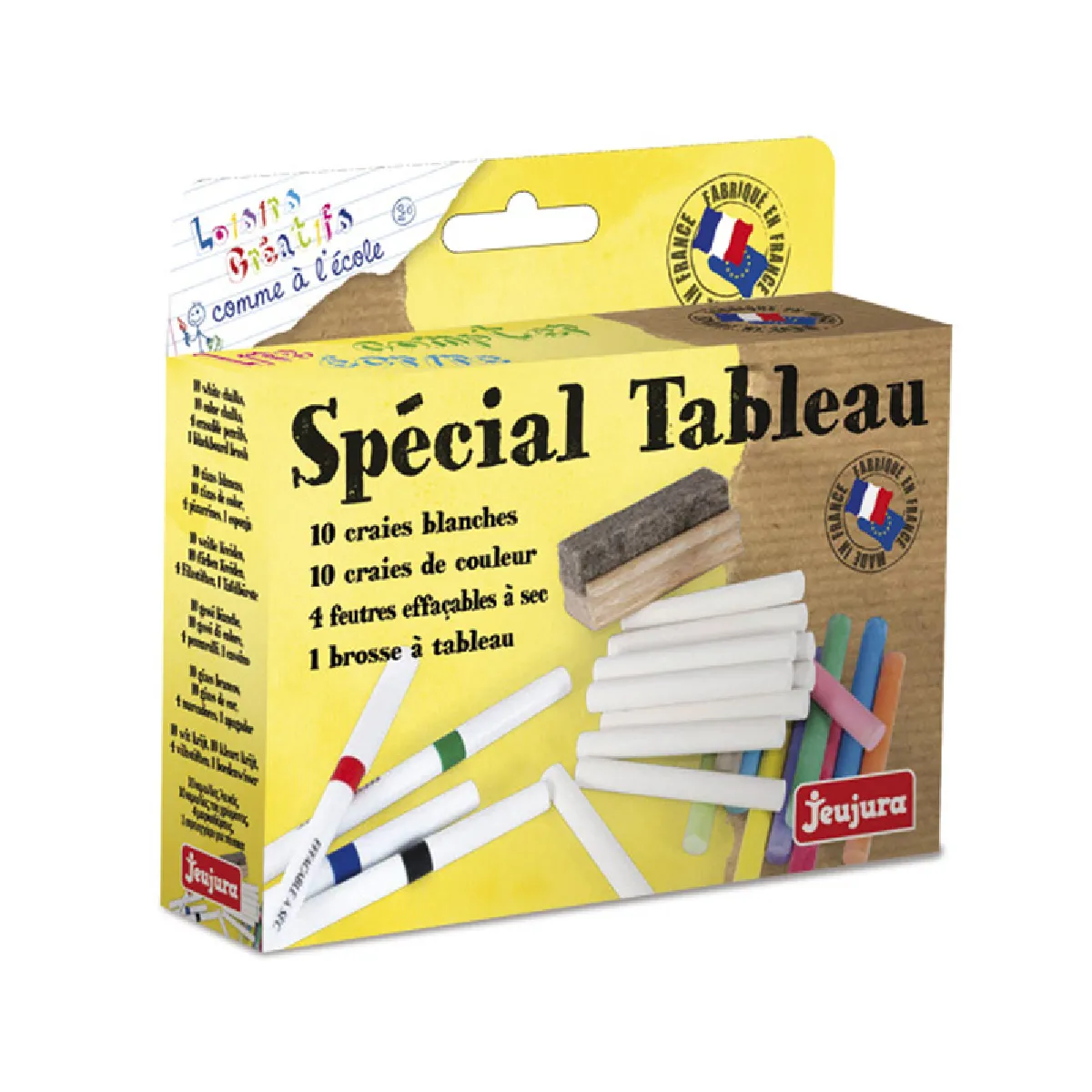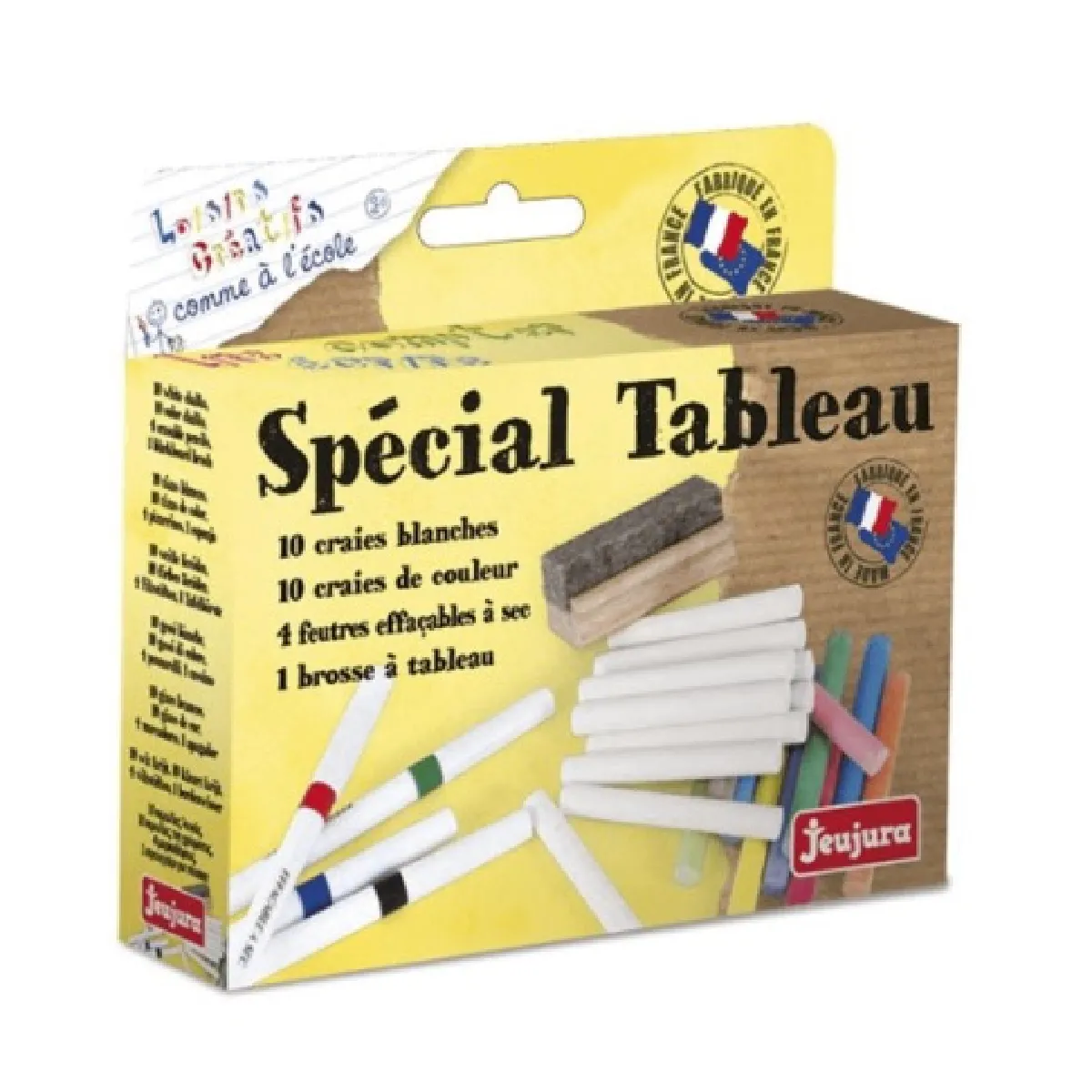 Coffret spécial tableau de JeujuraCe coffret contient tous les accessoires indispensables pour écrire sur son tableau. Il contient une brosse à tableau très facile à prendre en main, des craies pour écrire sur le tableau noir et des feutres effaçables à sec pour écrire sur la surface blanche du tableau.