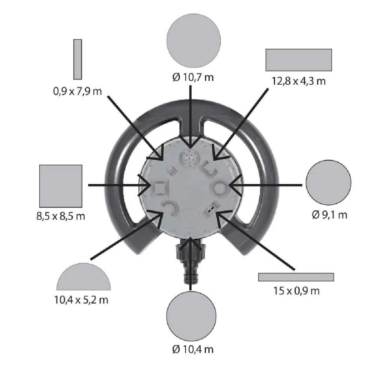 Arroseur multifonctions sur base, multijets Arroseur plastique multifonctions sur base offrant un choix de 8 types de jets differents pour convenir a toutes les formes et a tous les type d arrosage et configuration: Carre (8.5x8.5 m) Cercle (O10.7 10.4 et 9.1 m) Demi-cercle (10.4x5.2 m) Bandes (15x0.9 m - 12.8x4.3 m - 7.9x0.9 m) ... Surface arrosees jusqu a 90 m2 (O10.7 m) Surfacejusque 90m² (diametre 10,7m) Type de jet8 MatierePlastique Pression Max4 bars environ Garantie2 Reference fabricantPRA/AB.1421 MarqueRIBIMEX