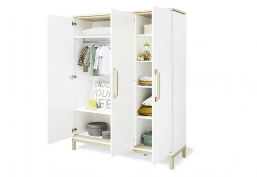 Les trois portes dissimulent une capacité bien pensée avec six étagères réglables en hauteur, afin d'adapter l'intérieur aux bodies, pyjamas, jouets ou linge de lit. La tringle prévue pour les vêtements suspendus facilite le tri des tenues et préserve les matières délicates. La fermeture en douceur limite les claquements et contribue à des gestes plus sereins au coucher ou lors des préparatifs du matin.