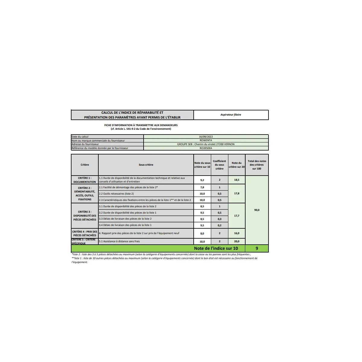 Fiche d'information calcul de l'indice de réparabilité (Rowenta RO3950EA) | |