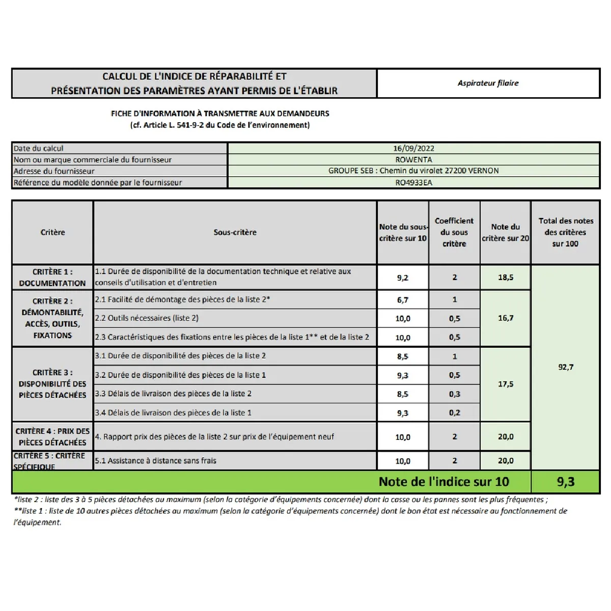 - Indice de réparabilité : 9,3