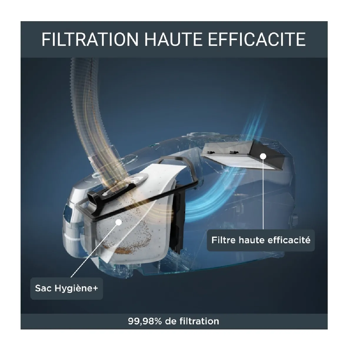 Le système multi-niveaux assure une filtration haute efficacité supérieure à 99,98 %, utile pour limiter la remise en suspension des particules. Recommandé pour les foyers sensibles, il est indiqué comme convient aux personnes souffrant d'allergies. La poignée classique avec brossette multi-usage intégrée facilite l'entretien des surfaces délicates, tandis que la brosse parquet fournie et le suceur fente optimisent le nettoyage des zones spécifiques.