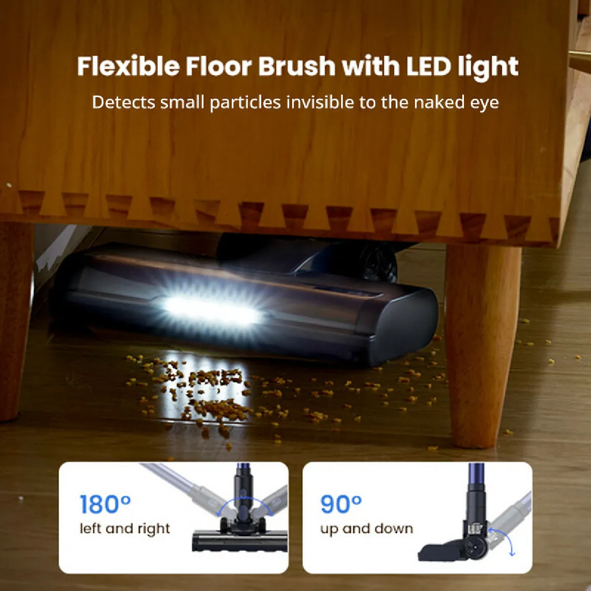 Le pivotement flexible à 180° sur le côté et à 90° de haut en bas vous permet de nettoyer votre maison dans toutes les directions. Les phares à LED intégrés éclairent les endroits ou les coins sombres pour un nettoyage plus approfondi.