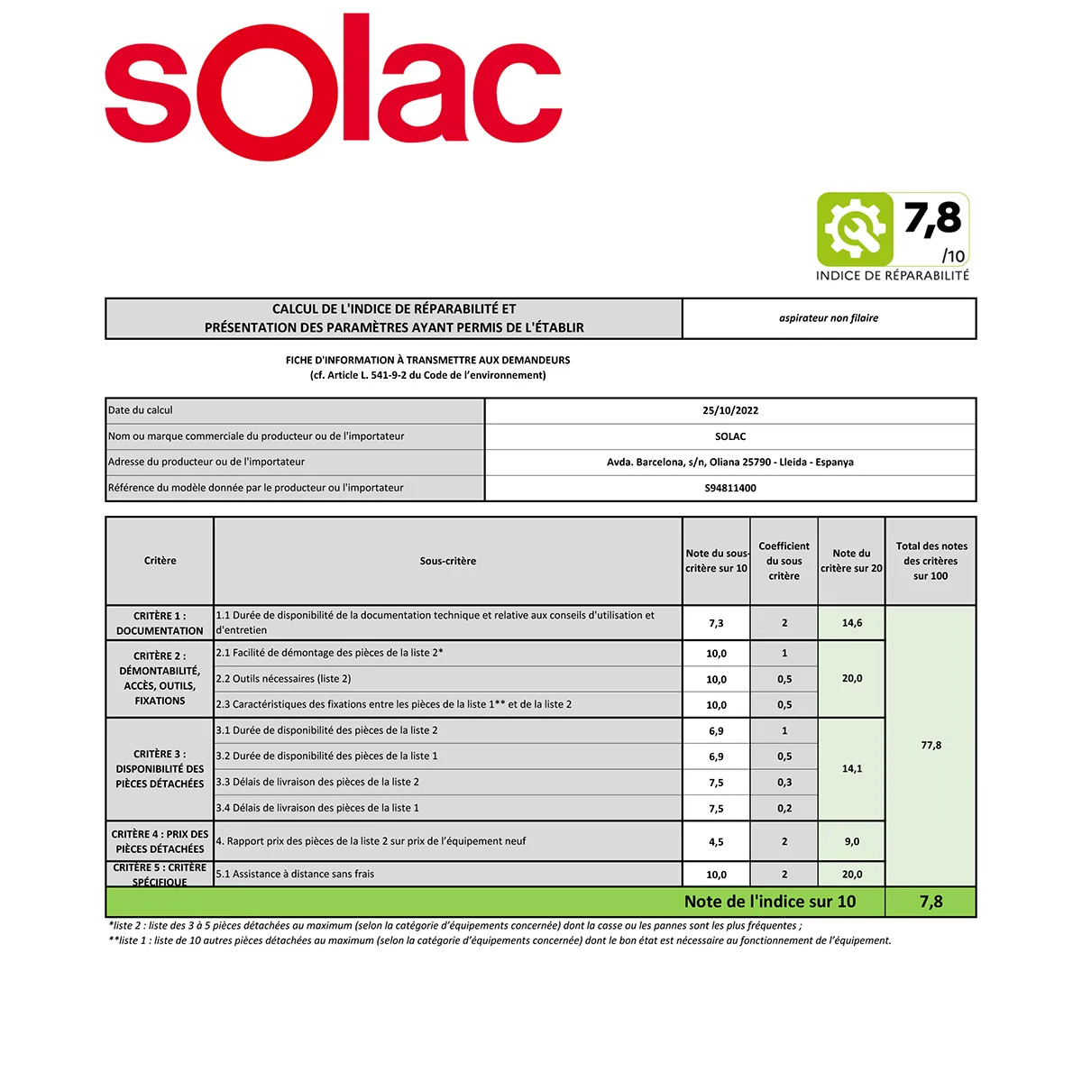 L'aspirateur à main intégré prend le relais pour les surfaces en hauteur, textiles ou l'habitacle d'un véhicule. Sans fil, il se transporte d'une pièce à l'autre sans contrainte, tandis que les accessoires spécifiques élargissent les usages sur plinthes et tissus. La conception sans sac limite les consommables et simplifie la vidange. L'appareil affiche un indice de réparabilité de 7,810, utile pour anticiper l'entretien. Son format 24 x 107 x 20 cm se range discrètement, prêt pour les nettoyages rapides comme pour les passages plus complets.