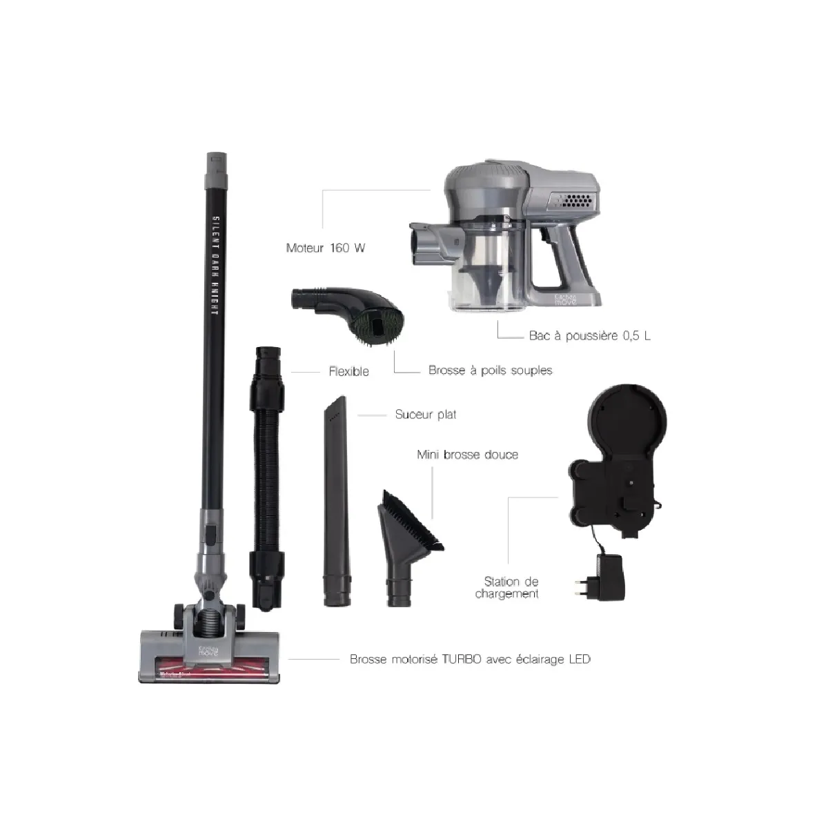Les accessoires fournis couvrent les recoins difficiles : flexible pour contourner les obstacles, suceur plat pour les fentes et sièges auto, et brosse turbo 2 en 1 avec LED pour mieux visualiser la poussière. Le système de filtration avec élément après moteur participe à la capture des allergènes et convient aux personnes sensibles. Avec son format compact (22 x 13 x H110 cm) et sa station de chargement murale, l'appareil reste accessible et prêt à l'emploi, idéal pour des passages rapides au quotidien comme pour un nettoyage plus approfondi.