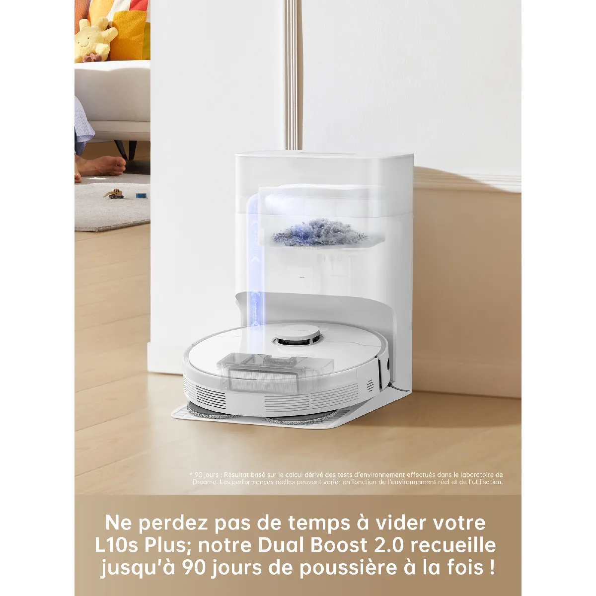 La station au sol intègre la technologie DualBoost 2.0 pour une collecte prolongée. Le sac à poussière de 4 L pour jusqu'à 90 jours de collecte limite la maintenance et maintient la performance d'aspiration. Le canal d'air évacue rapidement les débris vers le sac, réduisant la perte d'efficacité entre les sessions. Cette gestion centralisée assure un entretien simplifié, utile pour les foyers avec animaux ou des cycles fréquents.