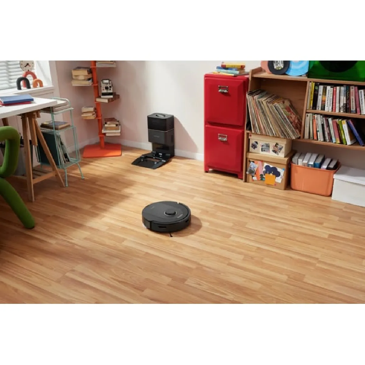 Le contrôle connecté permet d'accéder rapidement aux fonctions essentielles, dont la planification et la sélection des pièces. La puissance d'aspiration de 59 W et 5500 Pa garantit une traction homogène sur sols durs et tapis à poils courts. Grâce aux deux brosses en caoutchouc et à l'aspiration/lavage combinés, le robot traite la poussière, les miettes et les salissures légères en un seul passage. Le support de charge en station au sol stabilise l'accueil du robot, avec un gabarit de station de 440 × 305 × 448 mm adapté à une installation le long d'un mur.