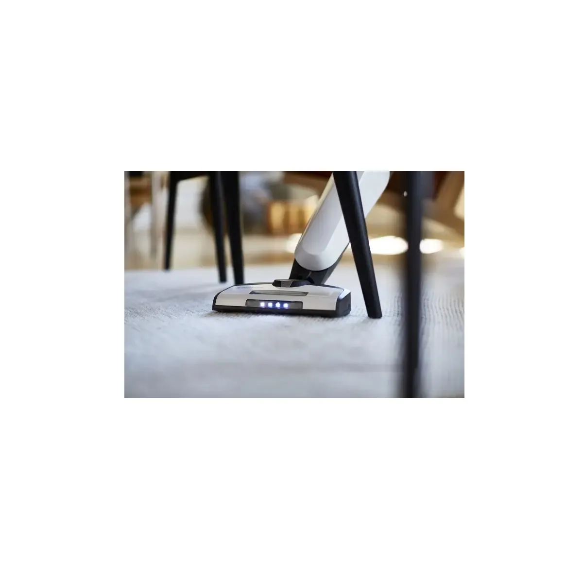 Les accessoires en série comprennent un embout combiné, un cutter, une brosse d'angle et un embout tissu, pour un usage précis sur différentes surfaces. La brosse éclairée améliore le guidage et la qualité de nettoyage sur les zones peu lumineuses, tandis que l'aspirateur à main se détache pour nettoyer tables, étagères ou voiture. L'ensemble, non connecté, garantit une utilisation simple axée sur l'efficacité sans réglages superflus.