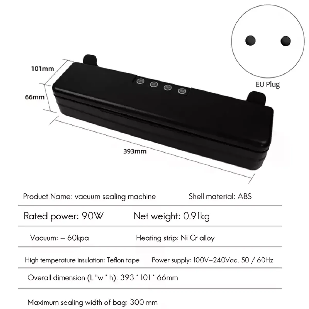 Adaptée à la préparation et au portionnage, elle aide à conserver fruits, noix, viande, sucreries et légumes, en réduisant les brûlures de congélation. Le phénomène de gonflement de certains sacs après mise sous vide des fruits et légumes est naturel et indépendant de la machine. Le format compact de 39,3 x 10,1 x 6,6 cm et un poids de 900 g facilitent le rangement. Livrée avec une machine de cachetage et un cordon d'alimentation. Prise EU ou prise américaine selon le pays d'utilisation mentionné. Couleur : noir. Matériau : ABS.