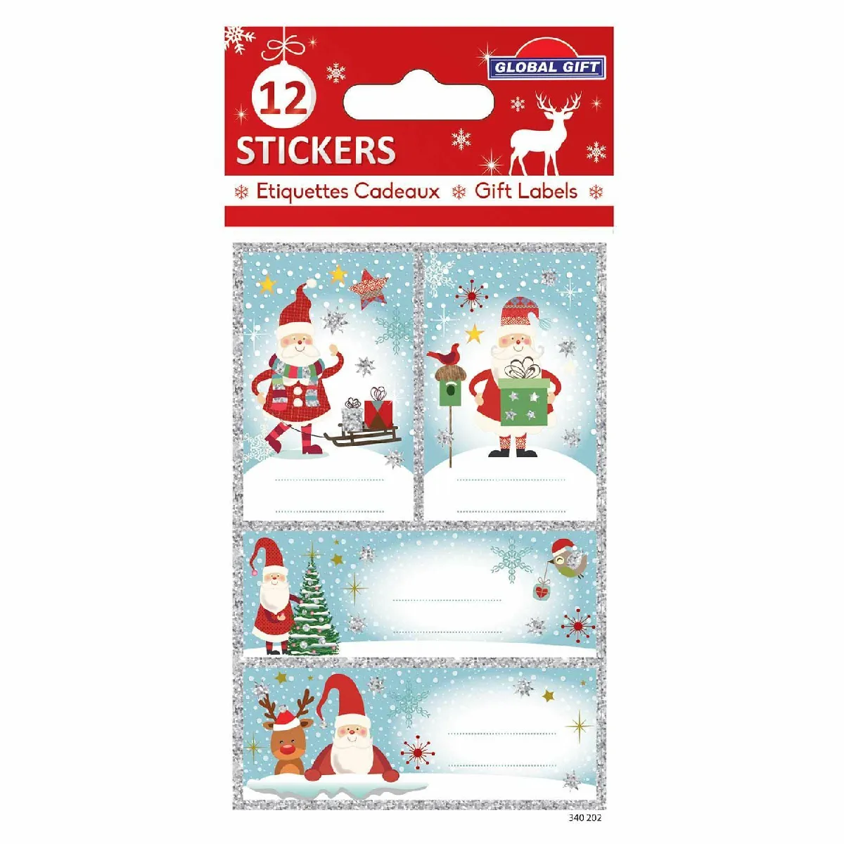 12 étiquettes adhésives sur le thème de Noël pour personnaliser vos cartes de voeux et vos cadeaux de Noël. Très pratiques à utiliser, vous pourrez embellir en un instant vos emballages de Noël et vos projets scrapbooking. Dimensions de la feuille d'autocollants : 7,5 x 12 cm. Motifs : père Noël. Stickers avec des paillettes argentées.