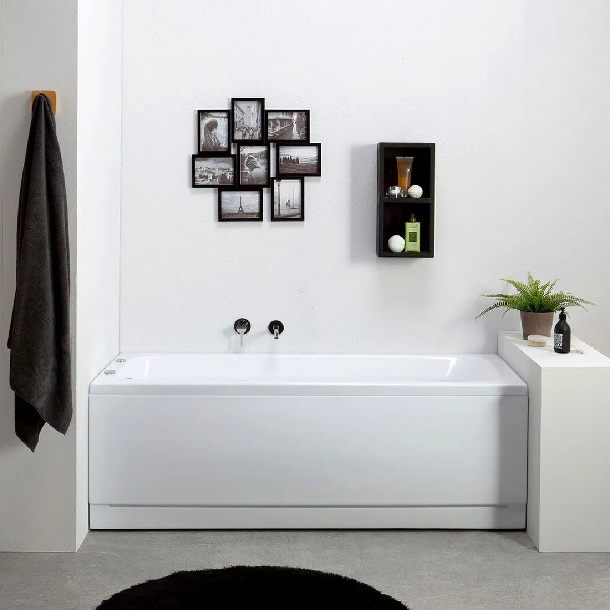 BAIGNOIRE BALNÉO RECTANGULAIRE EN ACRYLIQUE BLANC ENCASTRÉ ter est la nouvelle baignoire rectangulaire encastrée en acrylique blanc, un produit élégant à un prix abordable pour tous. Autrefois produit de niche et de luxe, le bain à remous est aujourd'hui à la portée de tous ceux qui souhaitent s'offrir un moment de détente à la fin de la journée. La baignoire Ester est livrée avec un panneau frontal pour une installation murale sur trois côtés. Les panneaux latéraux peuvent être achetés séparément. La baignoire est équipée de 7 jets d'hydromassage intégrés, qui sont activés par les deux boutons situés sur le bord. Nous déconseillons l'utilisation de détergents ou de bains moussants, qui pourraient obstruer les filtres.