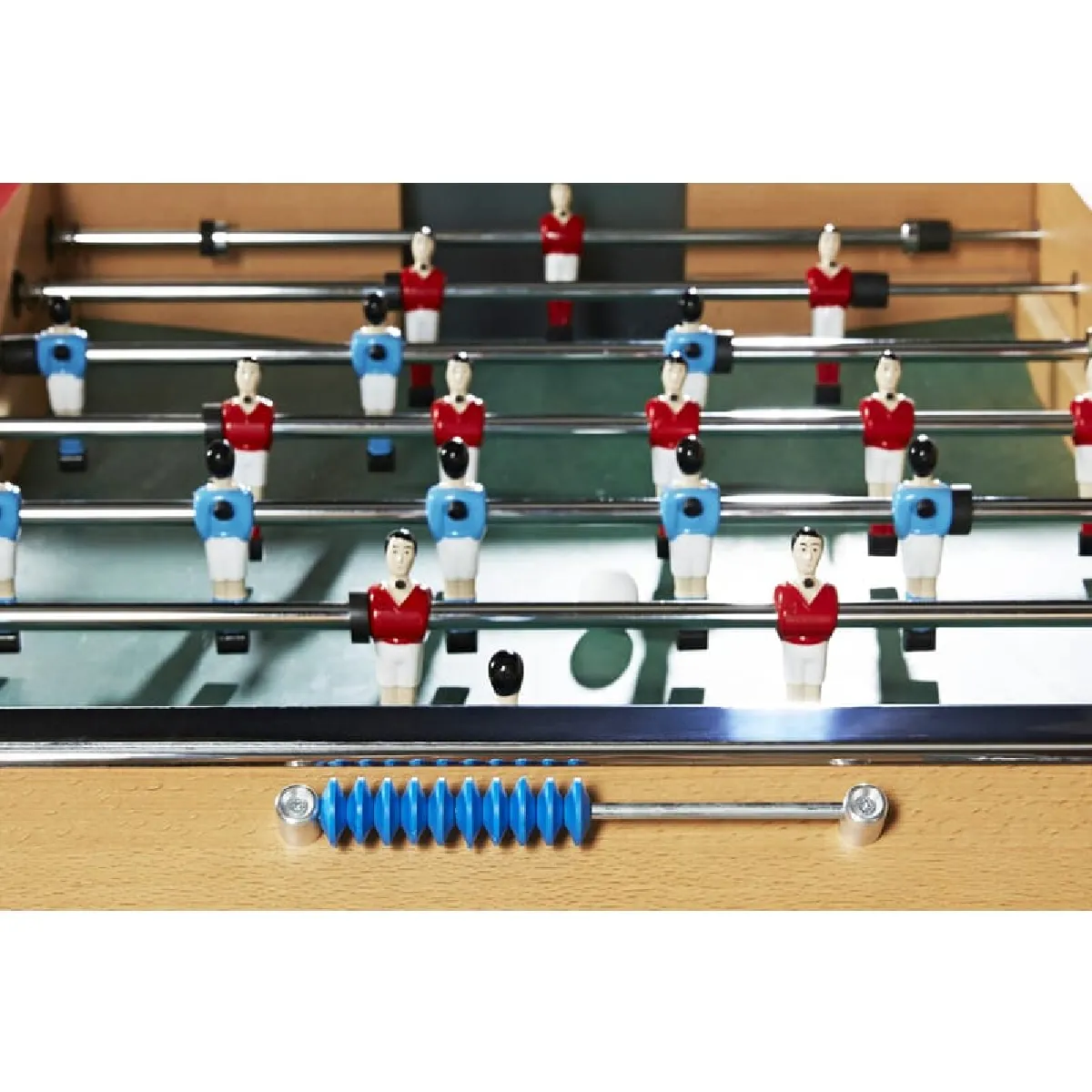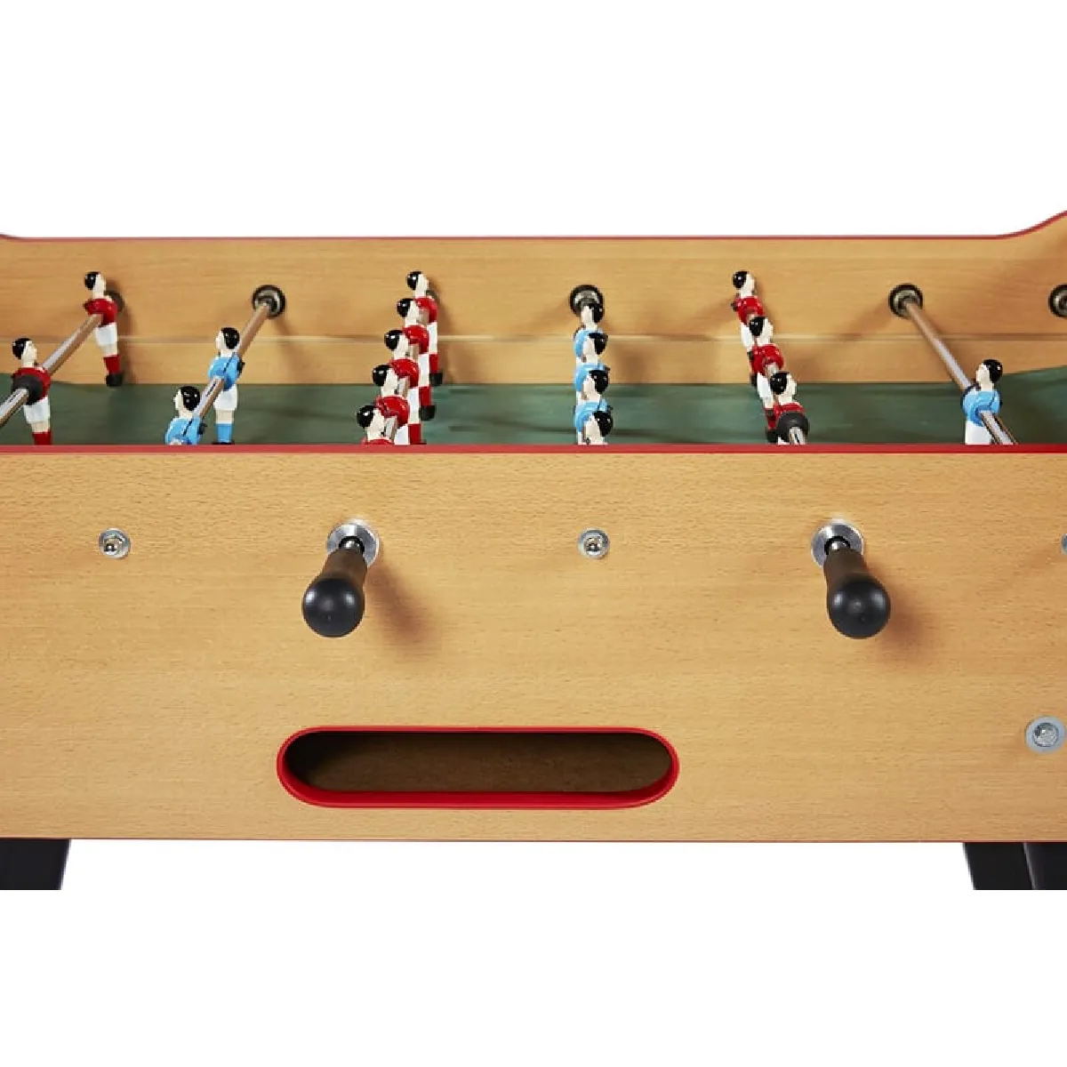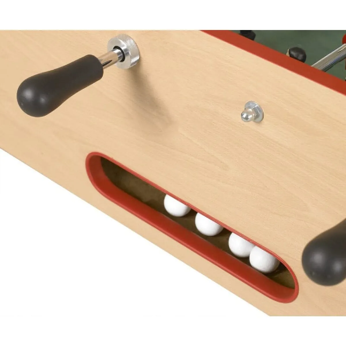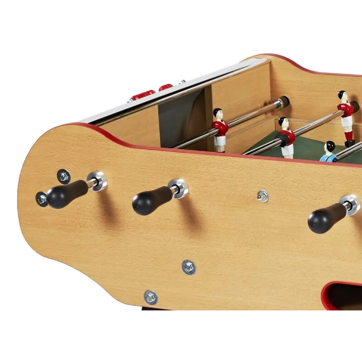 Le Baby-foot Leader est le modèle classique de la marque française première dans l’hexagone : René Pierre . Son design est celui qui a fait la renommée de la marque et qui renvoi aux parties dans les bars à la sortie du lycée . Avec une table de jeux de cette qualité, les adultes comme les enfants pourront jouer et retrouver les sensations du baby-foot de café. La caisse du Leader de René Pierre est en bois MDF avec des panneaux couleur hêtre et ses pieds sont en bois peints de couleur noir. Cette structure lui confère une grande stabilité avec poids de 73 kg parfaitement réparti . Le contour de la caisse et la main courante est de couleur rouge comme on peut trouver sur les tables Bonzini , Stella et autres fabricants français . Les pieds sont noirs et renforcés par un panneau en bois pour éviter les vibrations lors de parties sportives et des frappes lourdes! Le terrain est en Gerflex de couleur verte et les joueurs sont en fonte d’ aluminium vissés sur les barres avec maillots rouges ou bleus et short de couleur blanche. Ils sont traversés par une vis qui part du dos et traverse la gorge comme tout baby foot traditionnel de troquet . Les barres sont en acier chromé et sont surmontées de poignées longues ou rondes (au choix). De part et d’autre du terrain, le fonds des cages est équipé d’une plaque en Inox afin de pouvoir entendre ce bruit si familier de la balle qui fait BONG lors d’une gamelle ou de tir puissan t ! Les cages sont surmontées d’un compte point de chaque coté pour ne pas perdre le fil du match. Le baby-foot René Pierre Leader sera le modèle parfait pour tout amateur de football de table qui veut une table de qualité sans investir une fortune dedans. Livré en 1 semaine en moyenne, il est livré avec 2 balles en liège. La table est garantie 2 ans, les joueurs 10 ans et les barres une année. Contactez Baby Foot Vintage. Matière caisse: Panneau mélaminé hêtre Matière barres: Acier chromé Type de barre: Télescopiques Matière des joueurs: Aluminium Balles livrées: Livré avec 2 balles en liège Largeur: 95 cm Longueur: 154 cm Hauteur: 103 cm Poids: 73kg Monnayeur: Non
