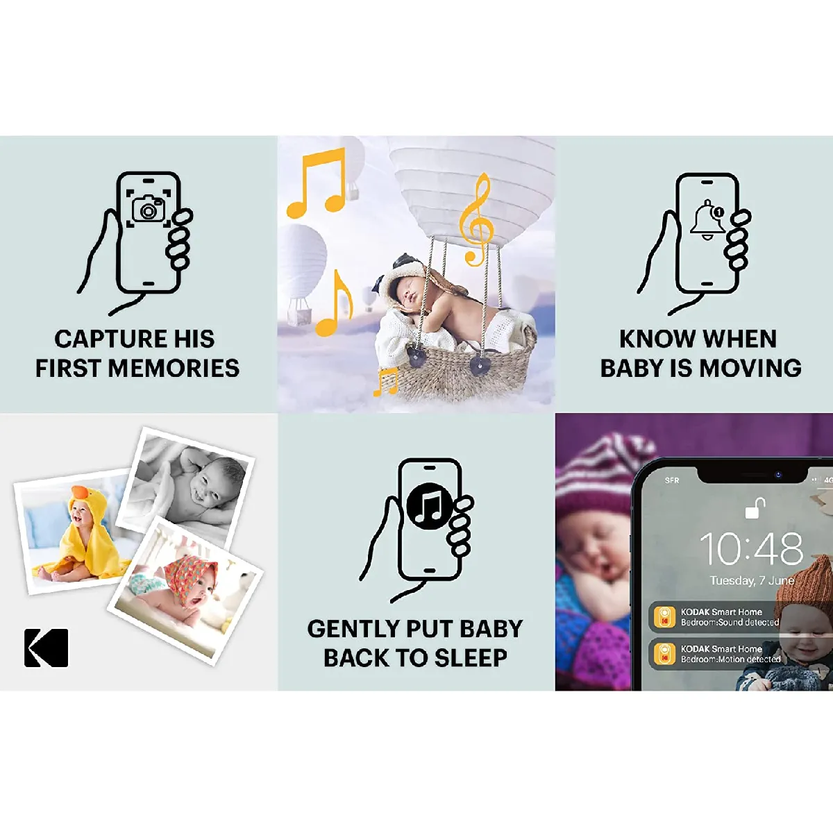 Le moniteur vidéo pour bébé KODAK CHERISH C525P vous aide à rester connecté à vos petits, à la maison ou sur la route. Grâce à la connectivité WiFi, le CHERISH C525P offre la possibilité de faire pivoter, d'effectuer un panoramique et de zoomer, afin de capturer encore plus de moments silencieux. Avec une caméra pour bébé KODAK et l'application Smart Home, vous pouvez savourer tous les bons moments du développement de votre bébé, sans perturber son sommeil.