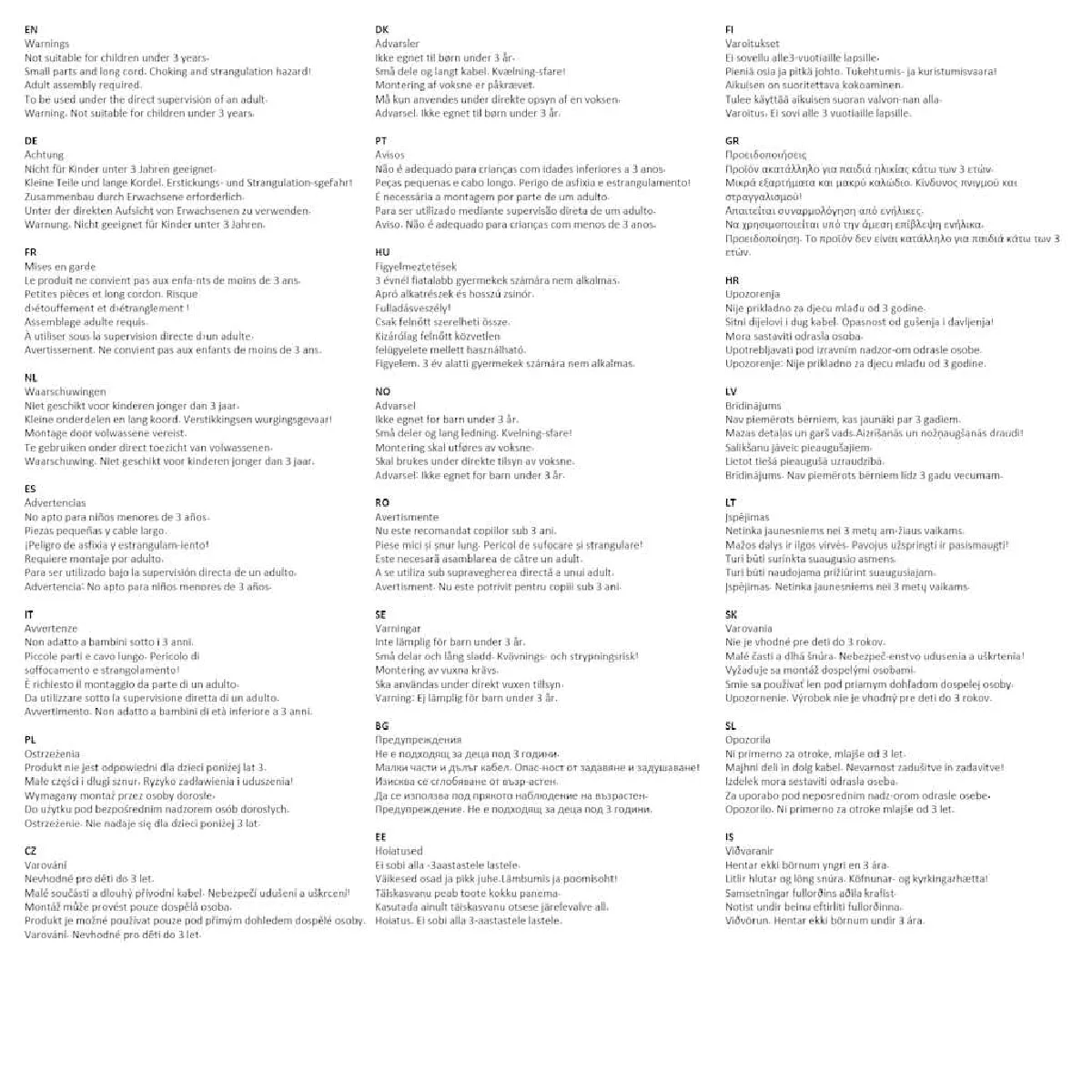 Mises en garde Le produit ne convient pas aux enfa-nts de moins de 3 ans. Petites pièces et long cordon. Risque détouffement et détranglement ! Assemblage adulte requis. À utiliser sous la supervision directe dun adulte. Avertissement. Ne convient pas aux enfants de moins de 3 ans.