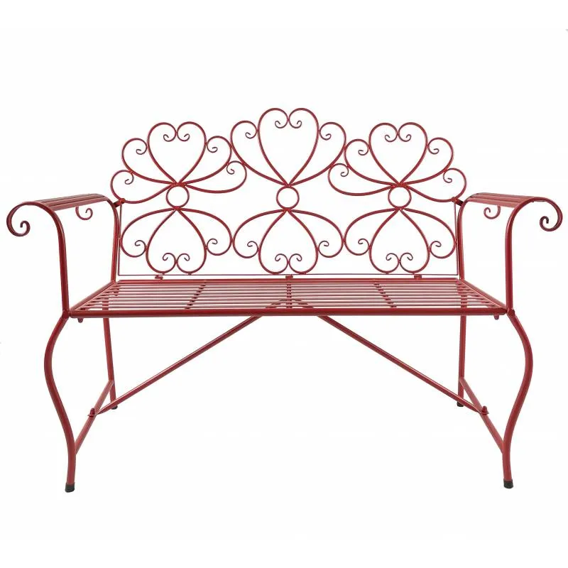 La finition en métal patiné rouge met en valeur les courbes et s'associe facilement à des coussins pour varier le confort et le style. Pour un rangement saisonnier, le banc est facile à démonter. En cas d'utilisation à l'année, il est recommandé de appliquer un vernis protecteur contre les intempéries. Ses proportions conviennent à un tête-à-tête au soleil, tout en s'intégrant à des aménagements champêtres, sur une terrasse ou près d'un massif fleuri.
