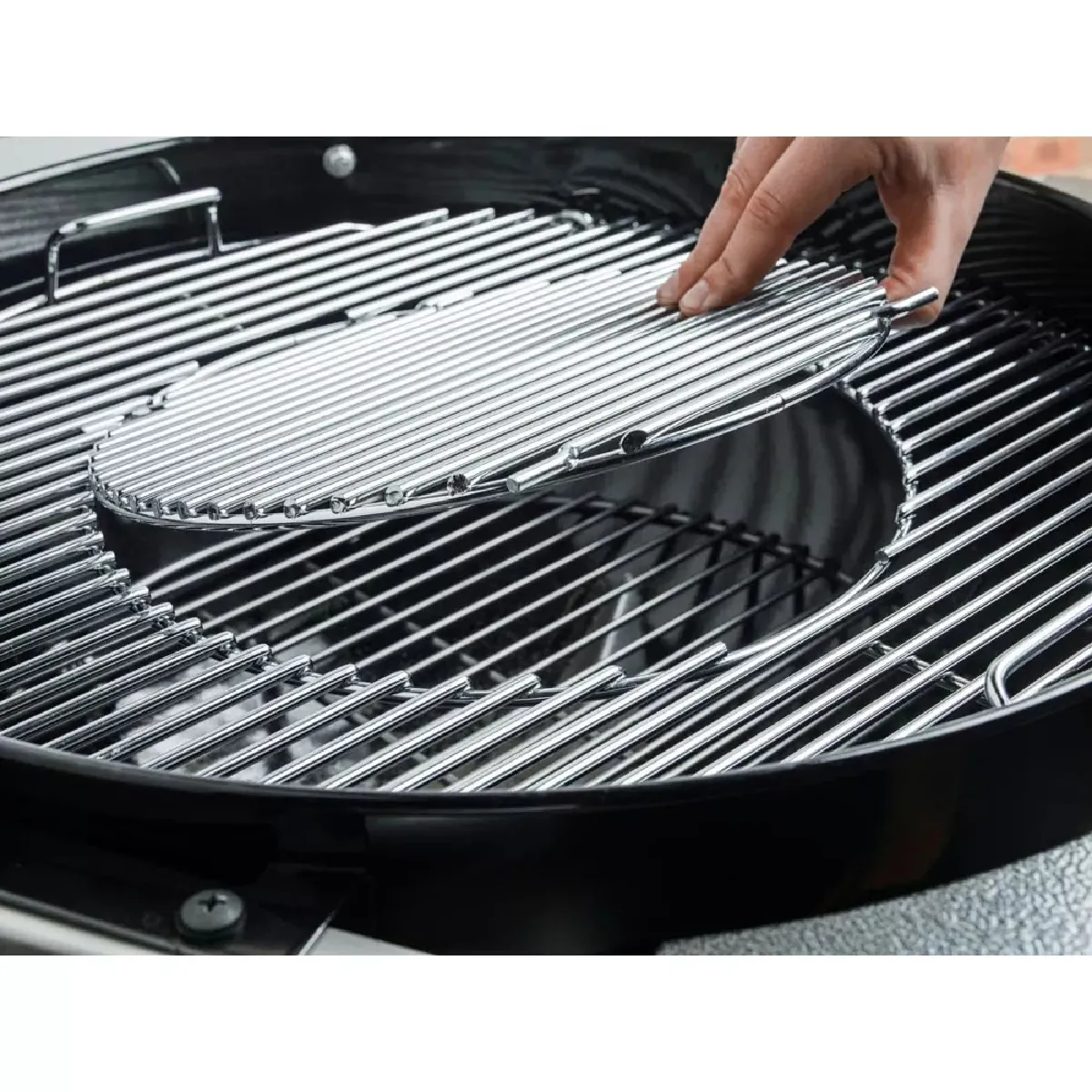 Grille de cuisson Gourmet BBQ System en acier chromé, articulée pour ajouter facilement des briquettes lors de la cuisson