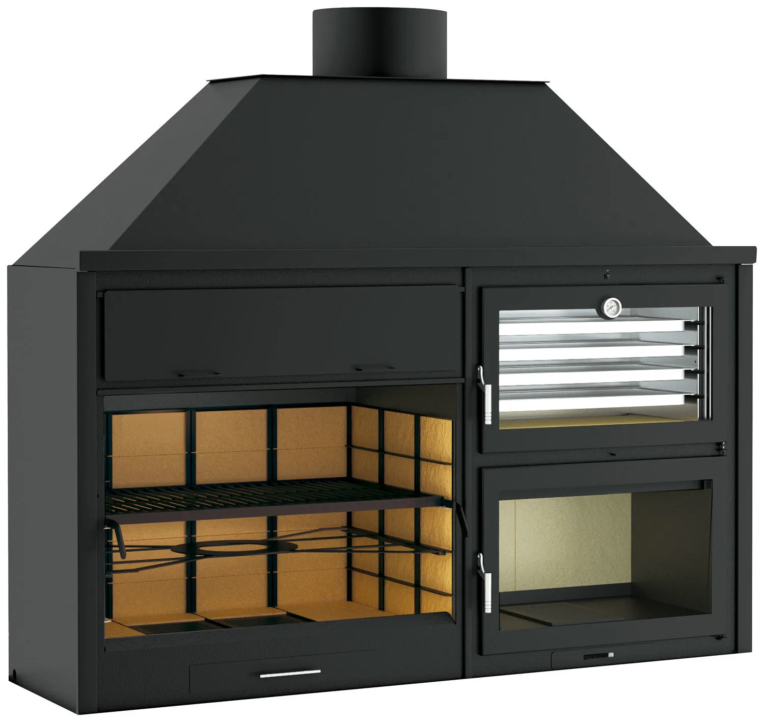 L'intérieur du four est démontable en acier inoxydable pour faciliter l'entretien, et un plat inox L.60 x P.35 x H.6 cm est inclus pour les cuissons au four. Les portes de four et de foyer en fonte renforcent la tenue à la chaleur, tandis que les grilles de cendrier en fonte soutiennent les braises avec stabilité. Le barbecue dispose d'un tiroir à cendre avec poignée inox et le foyer du four d'un tiroir dédié, pour un nettoyage rapide entre deux utilisations. Un support à paellera jusqu'à Ø 85 cm élargit encore les possibilités de recettes en extérieur.