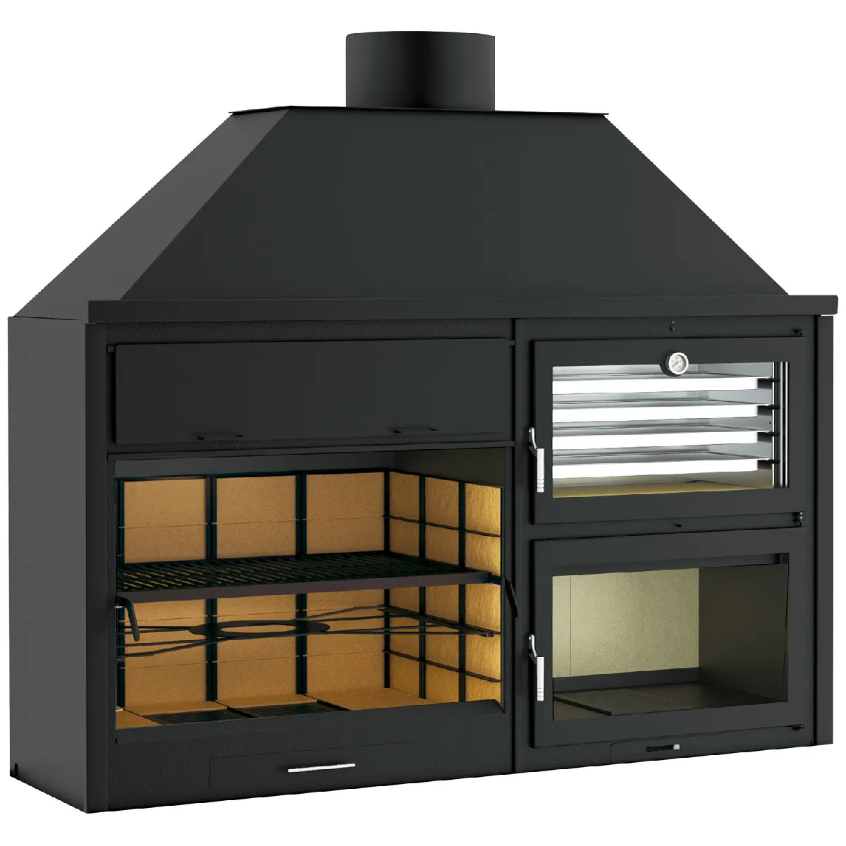 La structure est fabriquée en acier au carbone de 4 mm d'épaisseur, avec base et côtés du barbecue recouverts de briques réfractaires pour mieux conserver et répartir la chaleur. Le corps en acier laqué contribue à la protection de l'ensemble, tandis que l'intérieur du foyer de four en vermiculite améliore l'isolation thermique. Ces éléments aident à maintenir une température régulière, utile pour des cuissons homogènes et prévisibles sur la grille comme dans le four.