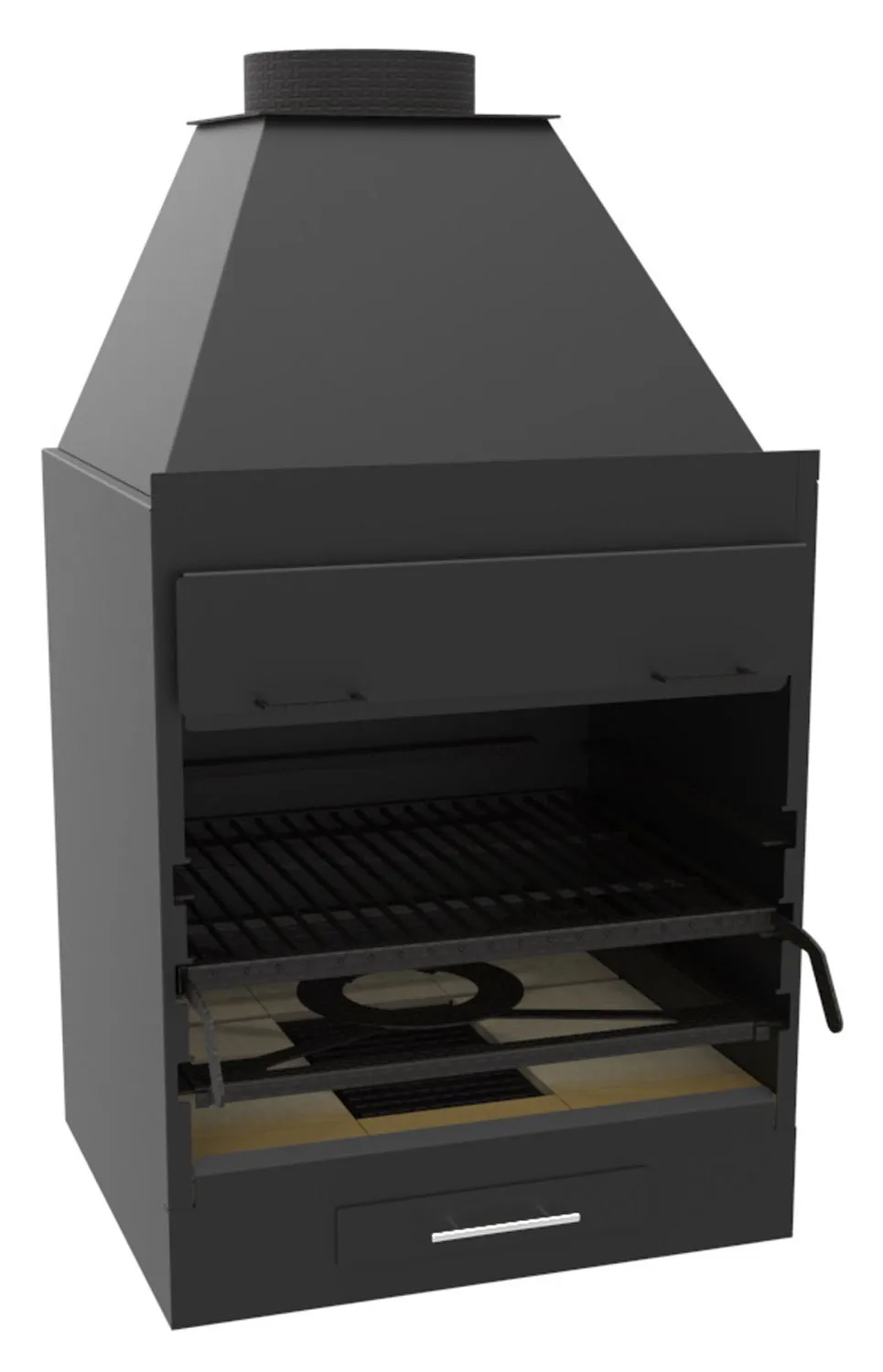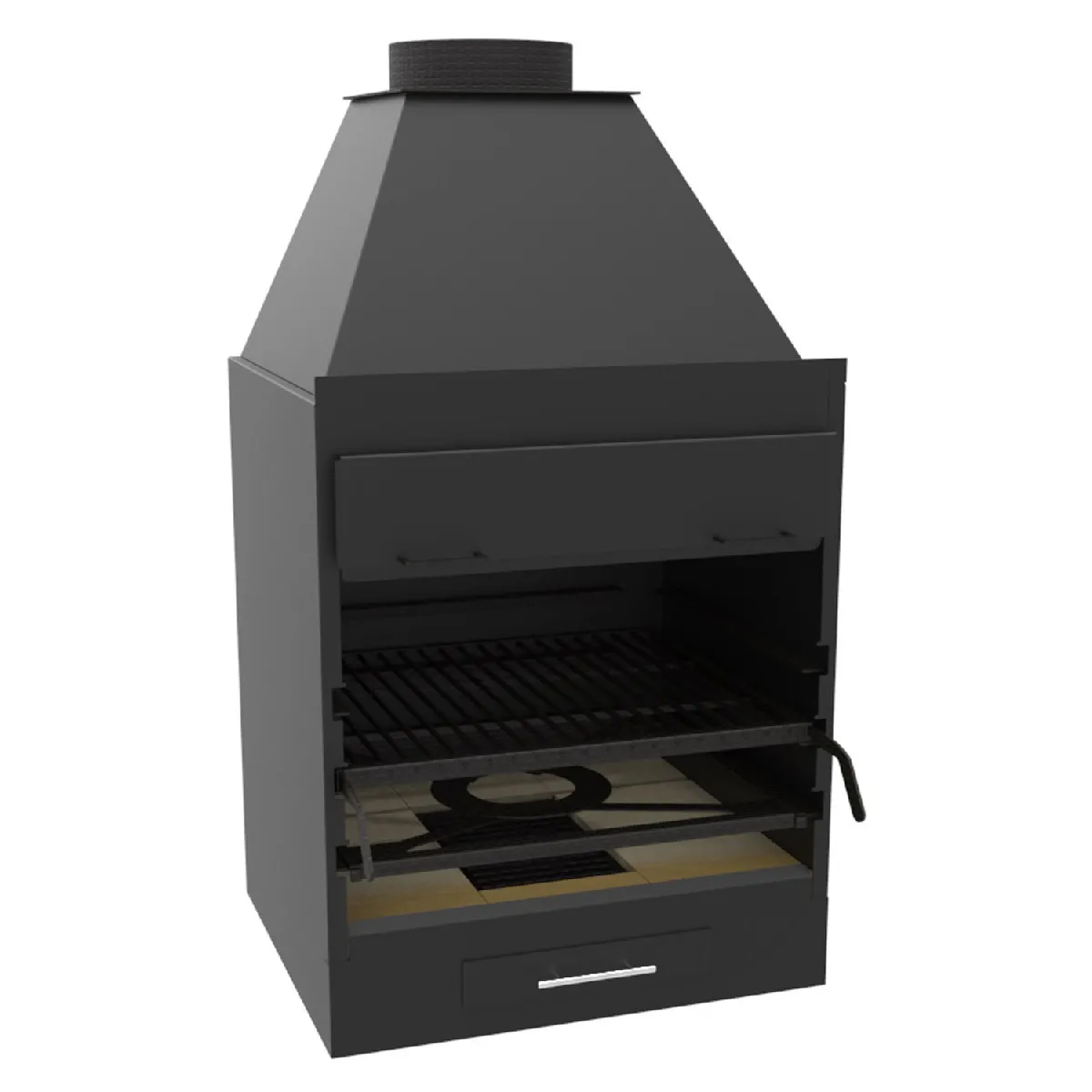 Le tiroir récupérateur de cendre avec poignée inox se retire d'un geste pour un vidage propre, soutenu par des éléments internes pensés pour la durabilité. Les grilles de cendrier en fonte protègent le foyer et facilitent l'évacuation des résidus. La fabrication en Espagne souligne un soin apporté aux matériaux et une conception orientée longévité. Adapté à des repas pour plus de 8 personnes, il garde une ergonomie simple à manipuler, avec un accès aisé au charbon et une gestion de la braise efficace sous couvercle.